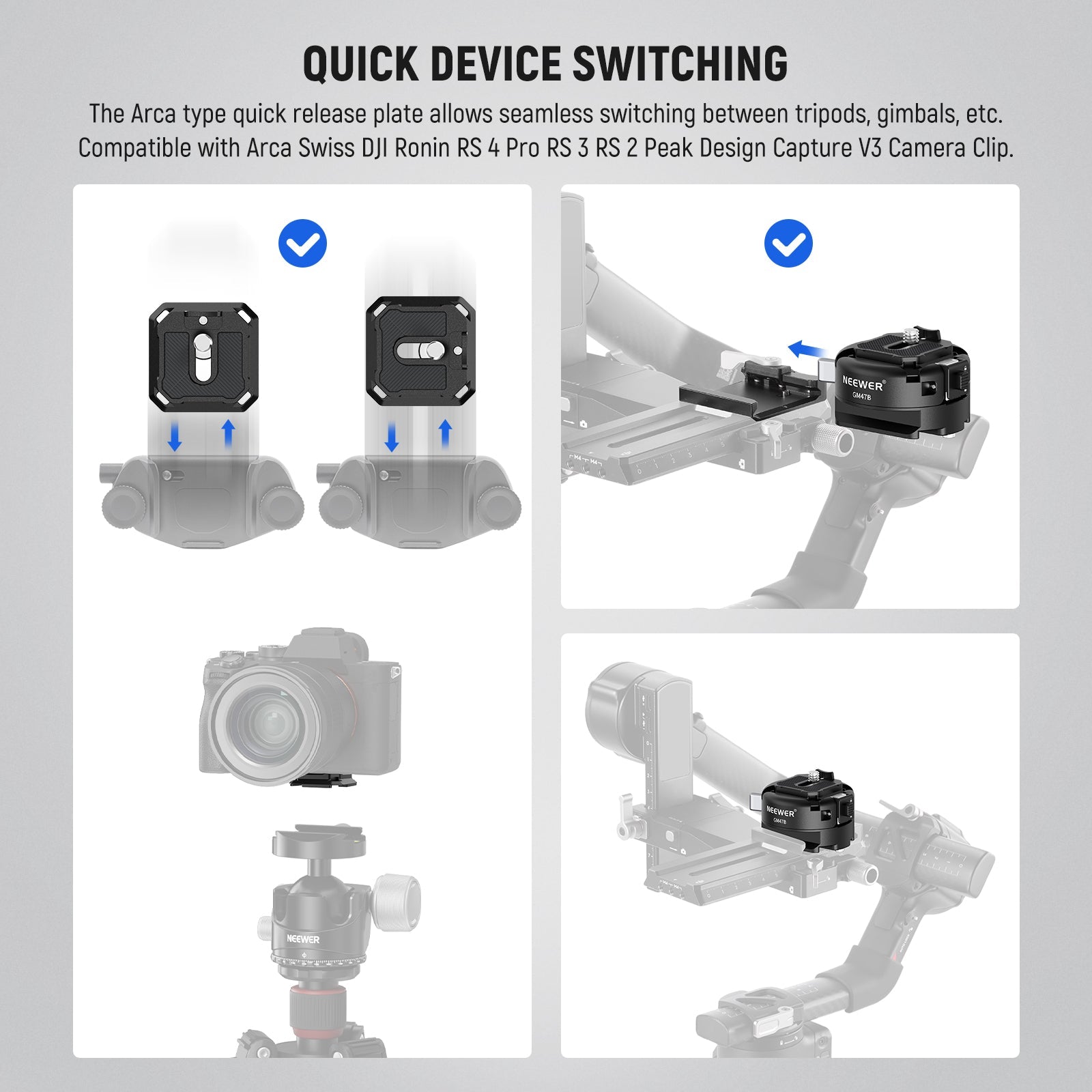 - Piastra a sgancio rapido a tripla compatibilità - Aggiornata per una maggiore compatibilità con gli stabilizzatori gimbal DJI RS 4/RS 4 Pro/RS 3/RS 3 Pro/RS 2/RS 2 Pro, questa piastra a sgancio rapido e la base di serraggio tipo Arca sono compatibili anche con il supporto a clip per tracolla da zaino Peak Design Capture Camera Clip V3 e con la piastra, consentendo la commutazione del dispositivo in 1 secondo con un semplice interruttore. Può essere montata anche su treppiedi, monopiedi o slider, facilitando riprese fluide con treppiedi e a mano libera.