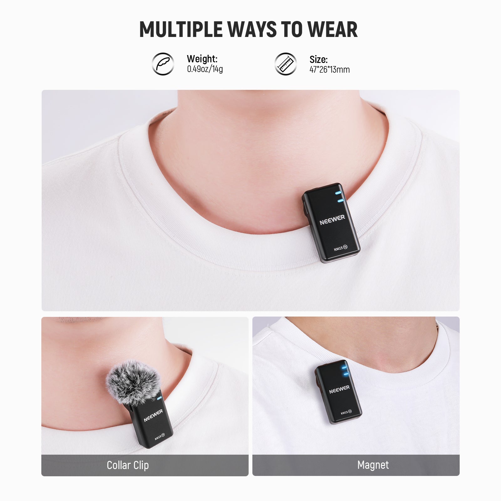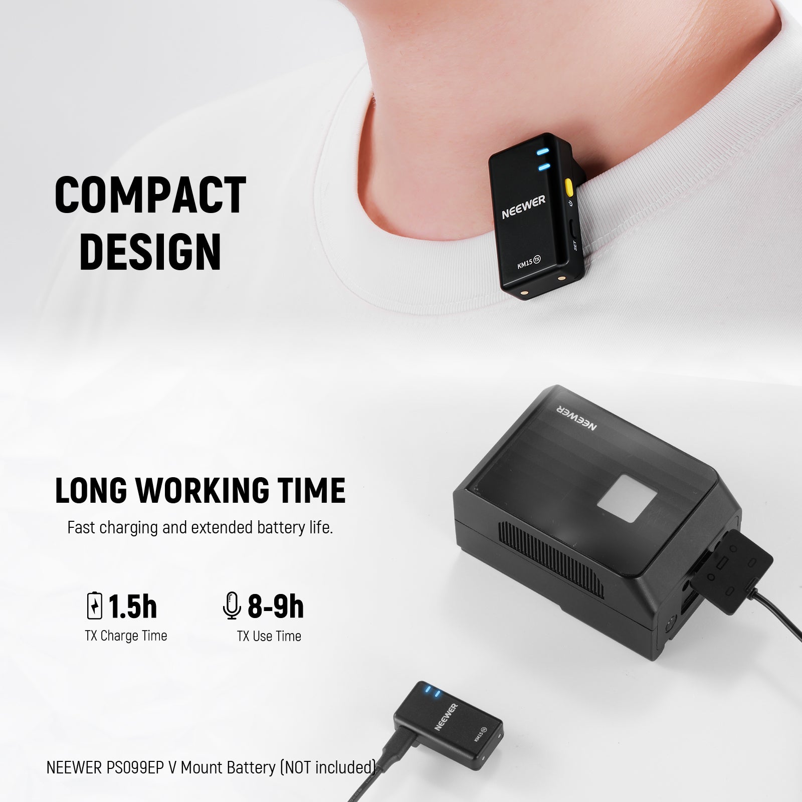 - Audio ad alta fedeltà : ogni trasmettitore è dotato di un microfono a condensatore omnidirezionale, in grado di correggere le curve vocali e di captare le voci a 360° per una qualità audio HD non compressa. Ogni TX ha un jack audio da 3,5 mm per collegare il microfono cablato come NEEWER CM5, garantendo requisiti audio professionali in varie scene. RX consente il monitoraggio in tempo reale e la ricarica del telefono tramite la sua interfaccia di tipo C e il controllo del volume tramite il pulsante di regolazione