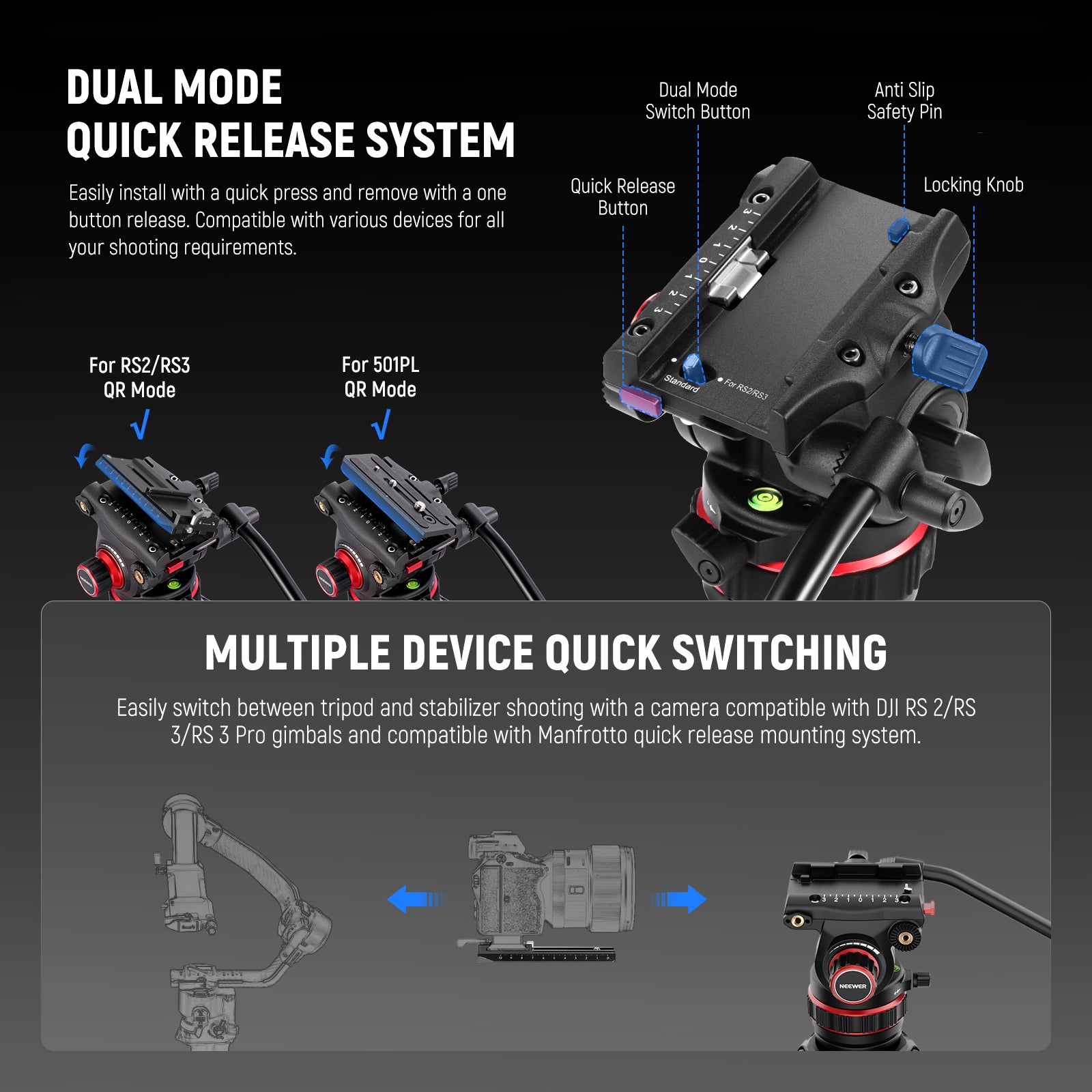 - Sistema QR per montaggio su telecamera a doppia compatibilità : passa da questo treppiede video allo stabilizzatore portatile per le riprese con questa testa per treppiede gimbal, compatibile con piastre a sgancio rapido 501PL compatibili con gli stabilizzatori gimbal DJI Ronin RS 3 Pro RS 2 RSC 2. Premi per bloccare la piastra QR sulla base del morsetto in 1 secondo o rilasciala tramite il pulsante laterale per staccare la telecamera montata, la gabbia della telecamera, il rig video e il rig a spalla. Il blocco di sicurezza anti-caduta mantiene il dispositivo in equilibrio durante lo spostamento