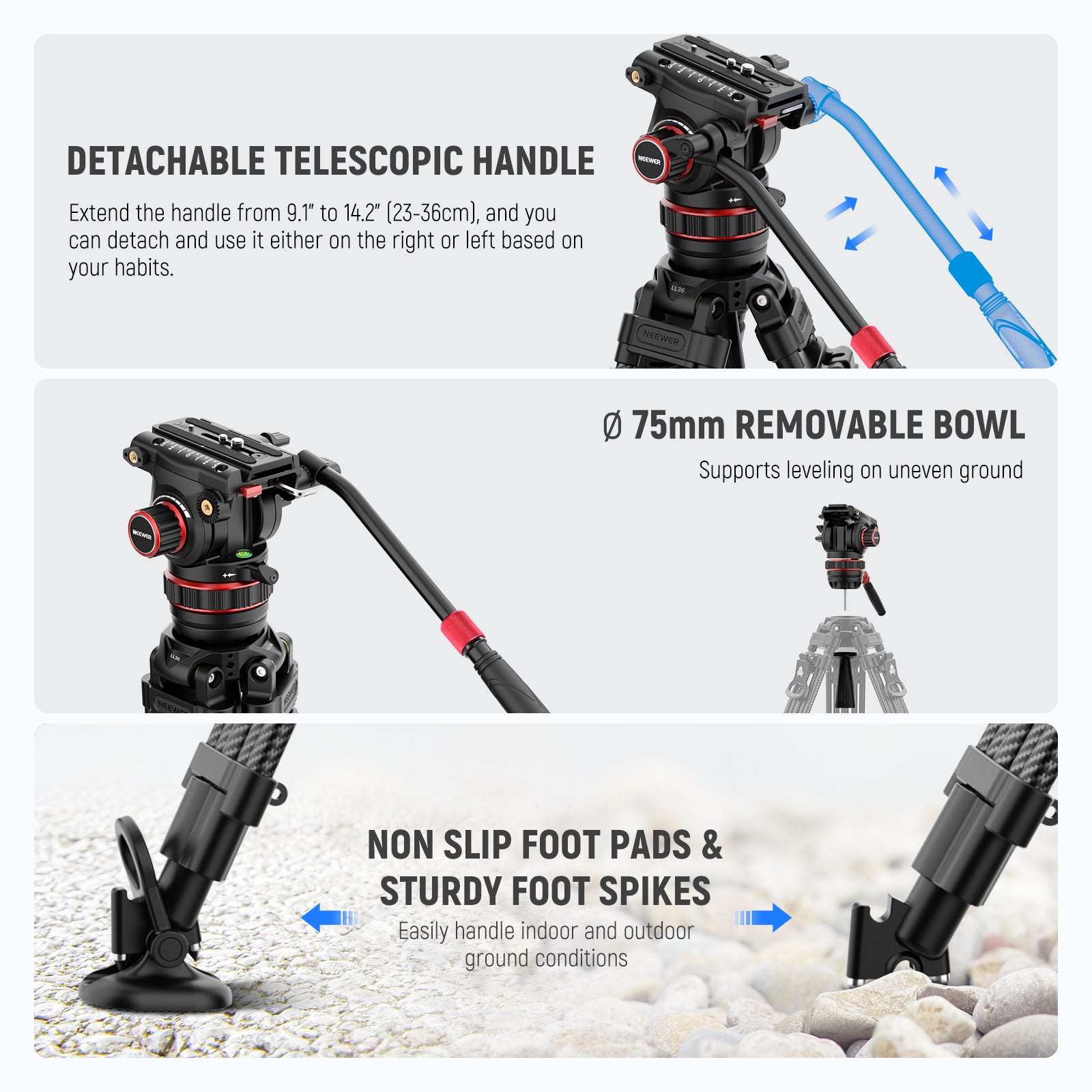 - Testa fluida con smorzamento regolabile Pan/Tilt - Questo treppiede video con testa fluida consente un pan di 360° e un tilt di +90°/-75°, con una manopola di smorzamento laterale e l'anello inferiore per regolare la resistenza del fluido rispettivamente per il movimento di inclinazione o pan. La testa a ciotola staccabile da ?75 mm aiuta a livellare rapidamente su terreni irregolari, aiutata dai piedini in gomma intercambiabili e dalle punte in acciaio, nonché da una livella a bolla integrata. L'impugnatura telescopica rimovibile da 9,1"-14,2"/23-36 cm per una diversa mano dominante