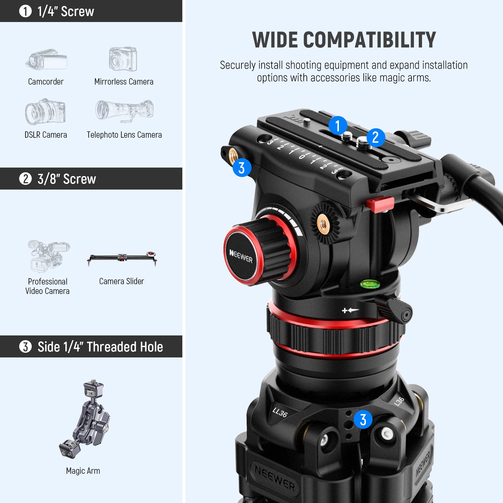 - Molteplici opzioni di montaggio : la vite superiore da 1/4" e da 3/8" sulla piastra a sgancio rapido è per fotocamere DSLR, fotocamere digitali, fotocamere mirrorless, videocamere, telescopi o slider. Inoltre, sia le gambe del treppiede che la testa fluida sono dotate di fori extra da 1/4" con spaziatura di 15 mm, che consentono il fissaggio di monitor, luci di riempimento a LED, microfoni, bracci magici e altri accessori compatibili con NEEWER compatibile con Smallrig