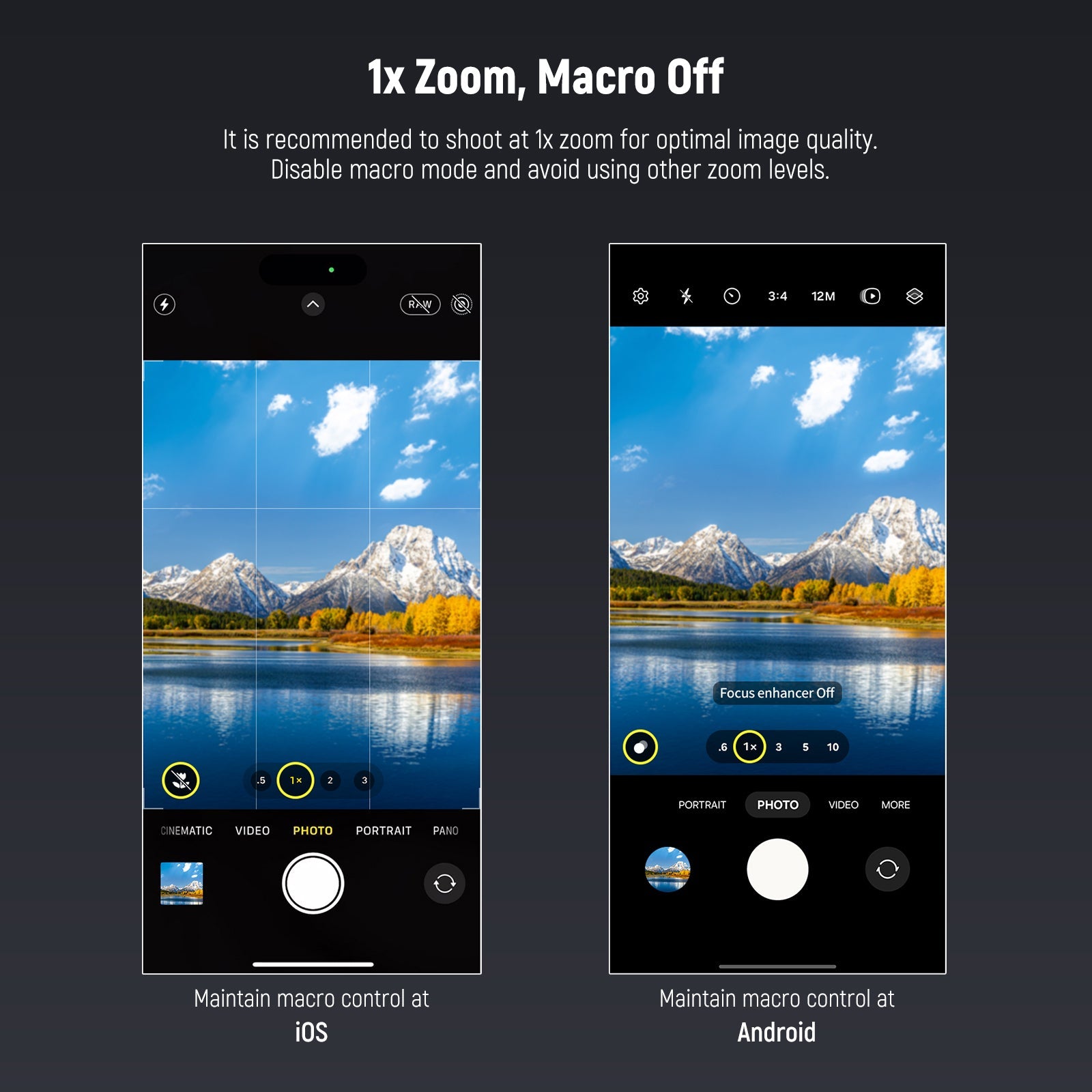 - Nota : prima dell'uso, pulire la fotocamera principale e le fotocamere aggiuntive del telefono. Potrebbe verificarsi vignettatura a seconda dei modelli di telefono. In questo caso, stringere l'obiettivo o aumentare l'ingrandimento della fotocamera a 1,1x