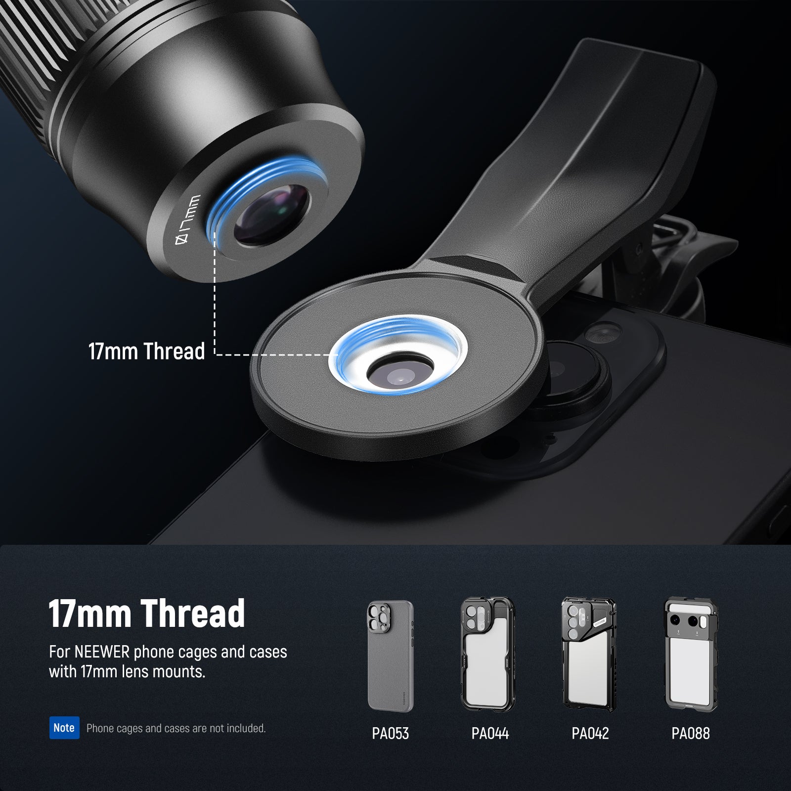• Universal Phone Lens Clip- The included clip securely mounts the lens to most smartphones, compatible with iPhone 16 Pro Max, iPhone 15 14 13 Pro Max, Samsung Galaxy S25 Ultra Android, and more. The lens can directly mount to NEEWER phone cages, phone cases, and backplates with 17mm threads for lens attachment