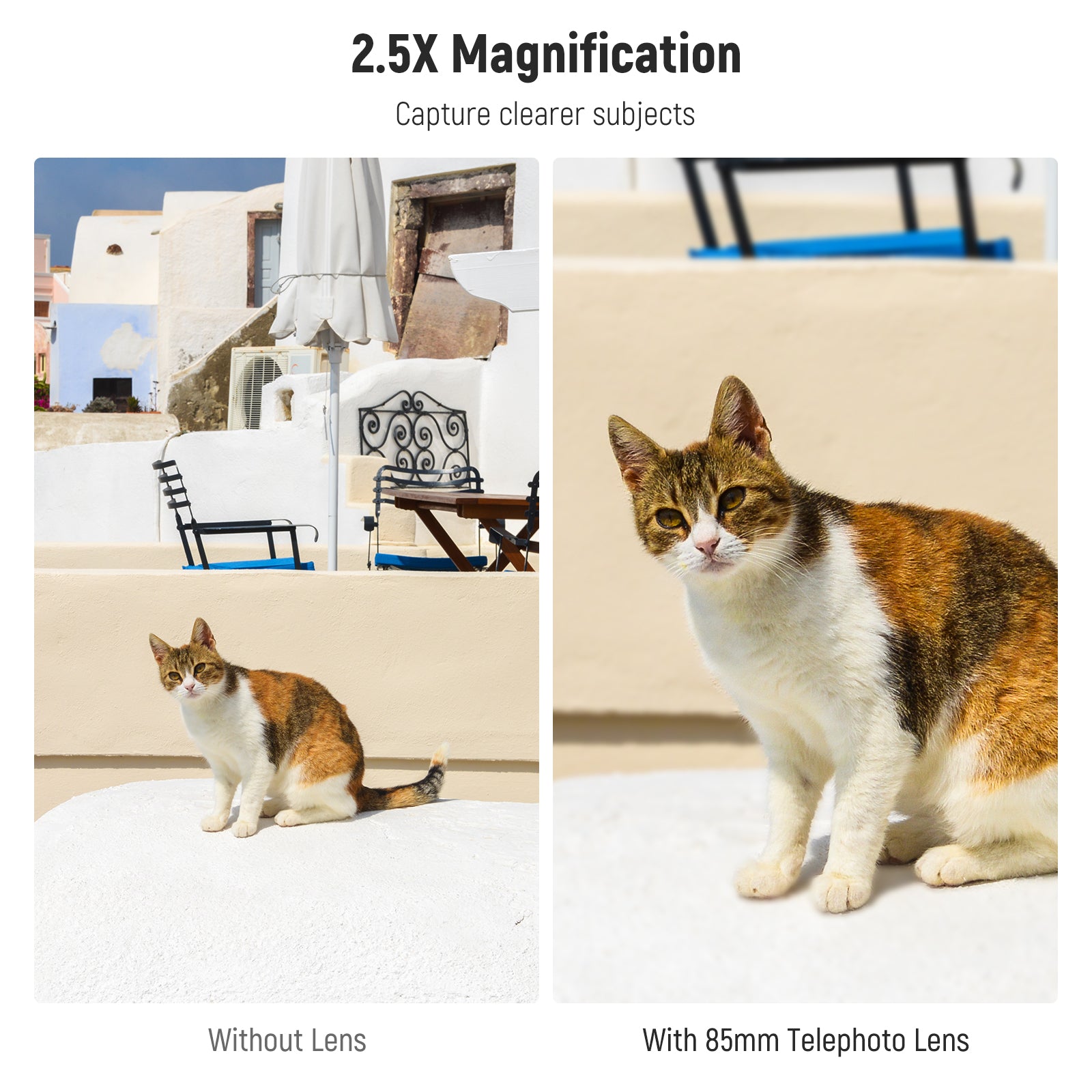 - Teleobiettivo 2.5X per ritratti eccezionale per telefono : scatti dettagliati e straordinari con questo accessorio teleobiettivo da 85 mm per il tuo telefono, perfetto per la fauna selvatica, lo sport e i paesaggi, in particolare per ritratti e riprese di qualità. Compatibile con iPhone 16, 15 Pro Max Plus, 14, 13, 12 Mini, Xr X, XS Max (eccetto grandangolo, si prega di disattivare la macro). Compatibile con Samsung Galaxy S24 Ultra e S23 (si prega di disattivare il miglioramento della messa a fuoco). 6 elementi in 5 gruppi per immagini nitide e straordinarie.