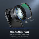 - Interfaccia frontale standard da 72 mm : presenta un'interfaccia frontale filettata M72 x 0,75 per collegare filtri per obiettivi telefonici come ND, VND, CPL, UV e filtri ad effetto per riprese più professionali.