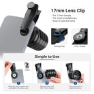 - 17mm Threaded Lens Clamp- Clip on the Main Camera and mount lenses via 17mm threads. Compatible with iPhone 17 Pro Max, Air, 16 Pro Max, Galaxy S25 Ultra, and other Android cell phones for photography and filming