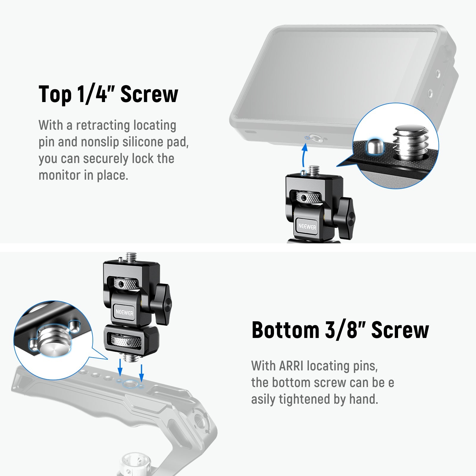 Supporto per monitor per fotocamera stile ARRI - Progettato per montare facilmente e in modo sicuro i monitor per fotocamera da 5"~7" sulla parte superiore della gabbia della fotocamera (come NEEWER CA011, CA004, CA002). La vite zigrinata inferiore da 3/8" con perni di posizionamento ARRI può essere facilmente serrata a mano. Perfetta compatibilità con gabbie per fotocamere SmallRig, piattaforme video, maniglia superiore e compatibilità con altri accessori di piccole dimensioni.