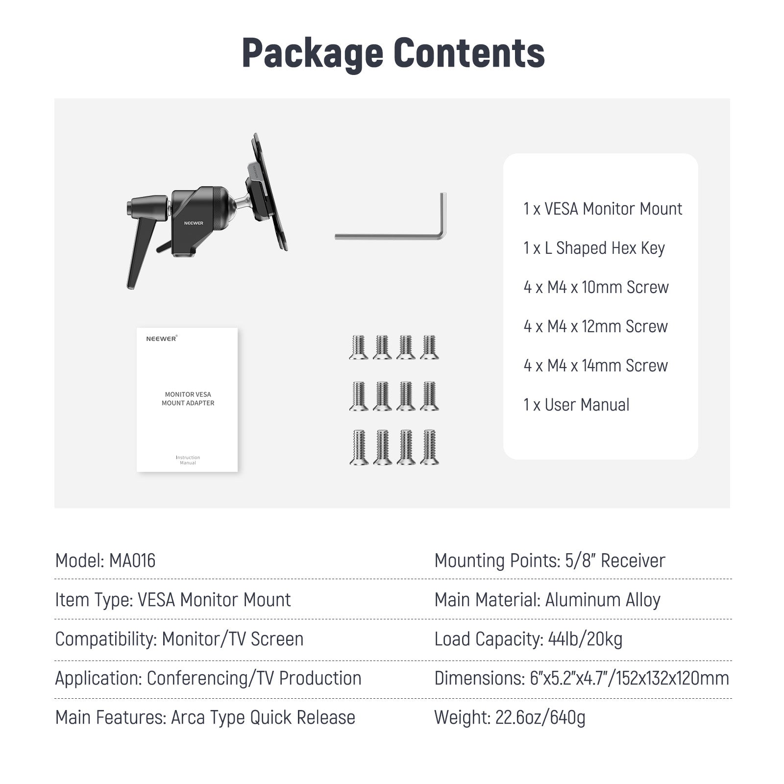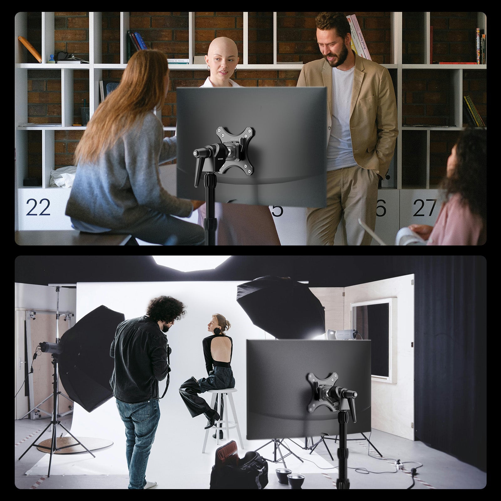 - Adattatore universale per ricevitore da 5/8" : progettato con un ricevitore da 5/8", il supporto per display può essere collegato a un supporto a C, un supporto per monitor da tavolo e un supporto per luci ad alta resistenza con un perno da 5/8" per conferenze, presentazioni, produzione TV e interviste.