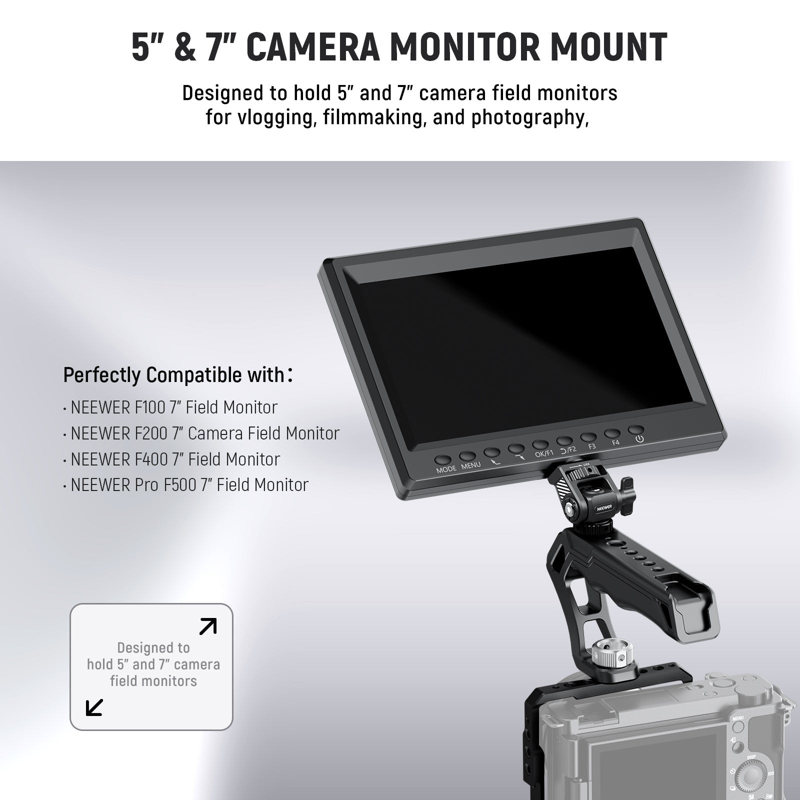 - Per monitor da campo per telecamere da 5" e 7" - Progettato per monitor da campo per telecamere da 5" e 7", questo supporto per monitor con slitta a contatto freddo è compatibile con le gabbie per telecamere SmallRig e NEEWER compatibili con telecamere Canon Sony Nikon Fujifilm Fuji, video rig, accessori per maniglia superiore, maniglie laterali, maniglie per imbracatura cardanica e slitta a contatto caldo per telecamere, perfetto per vlog, riprese cinematografiche e fotografia