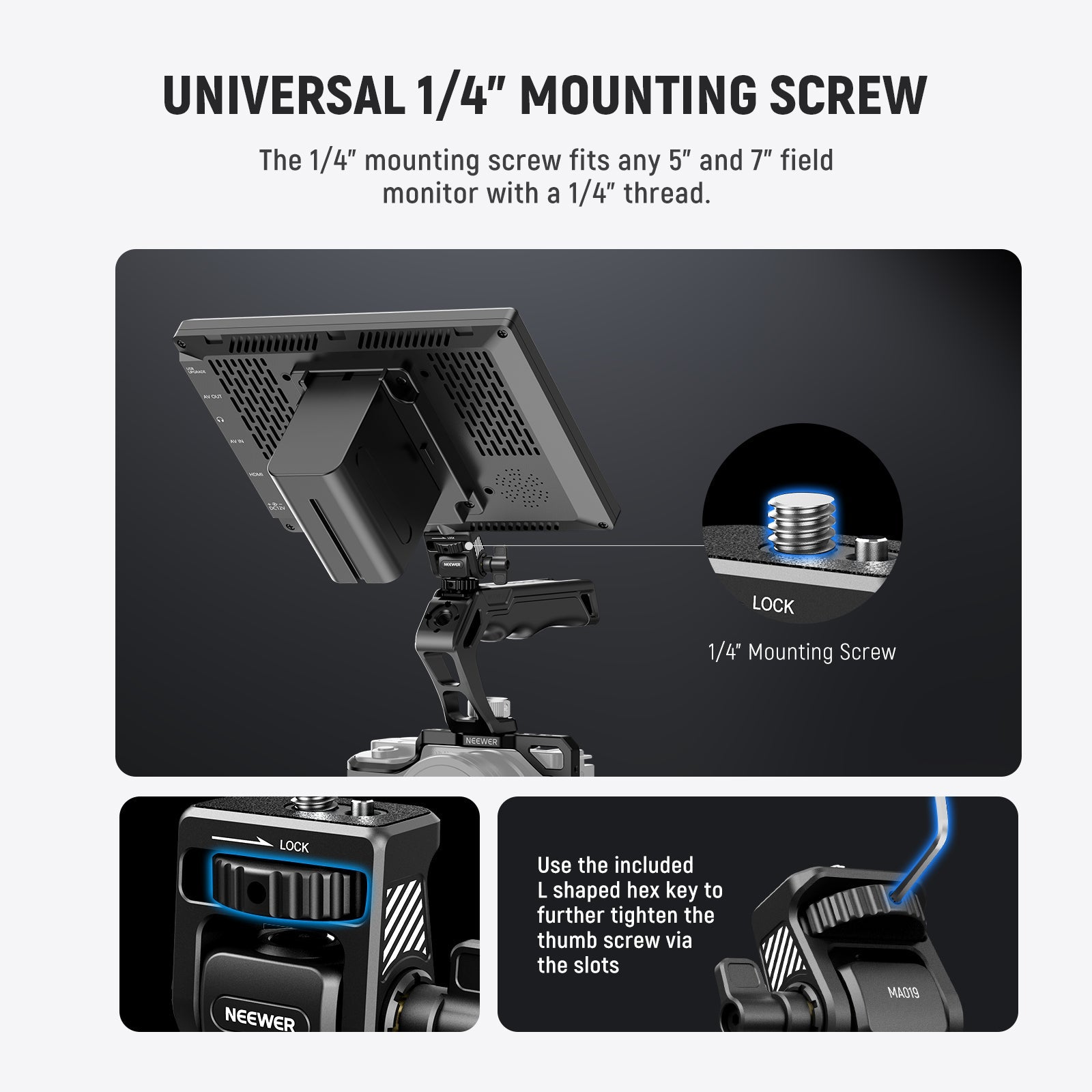 - Vite di montaggio universale da 1/4" - La vite di montaggio da 1/4" si adatta a qualsiasi monitor da campo da 5" e 7" con filettatura da 1/4". Per fissare la vite, stringere manualmente la rotella o utilizzare la chiave esagonale inclusa per una maggiore sicurezza