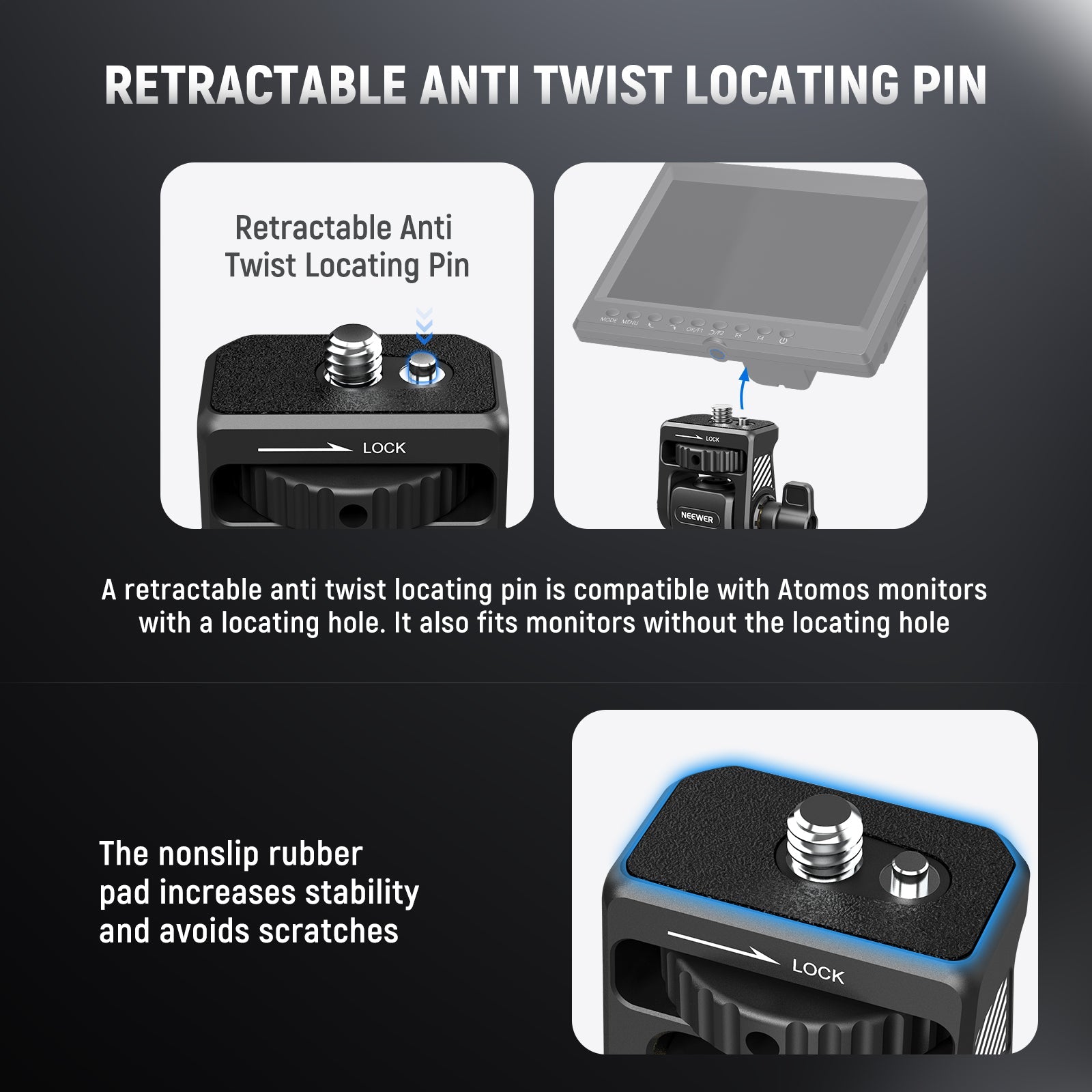 - Perno di posizionamento anti-torsione retrattile - Un perno di posizionamento anti-torsione retrattile è compatibile con Atomos Ninja V Ninja V+ e altri monitor con un foro di posizionamento, o monitor NEEWER F100 F200 F400 Pro F500 senza foro di posizionamento. Il cuscinetto in gomma antiscivolo aggiunge stabilità e previene i graffi