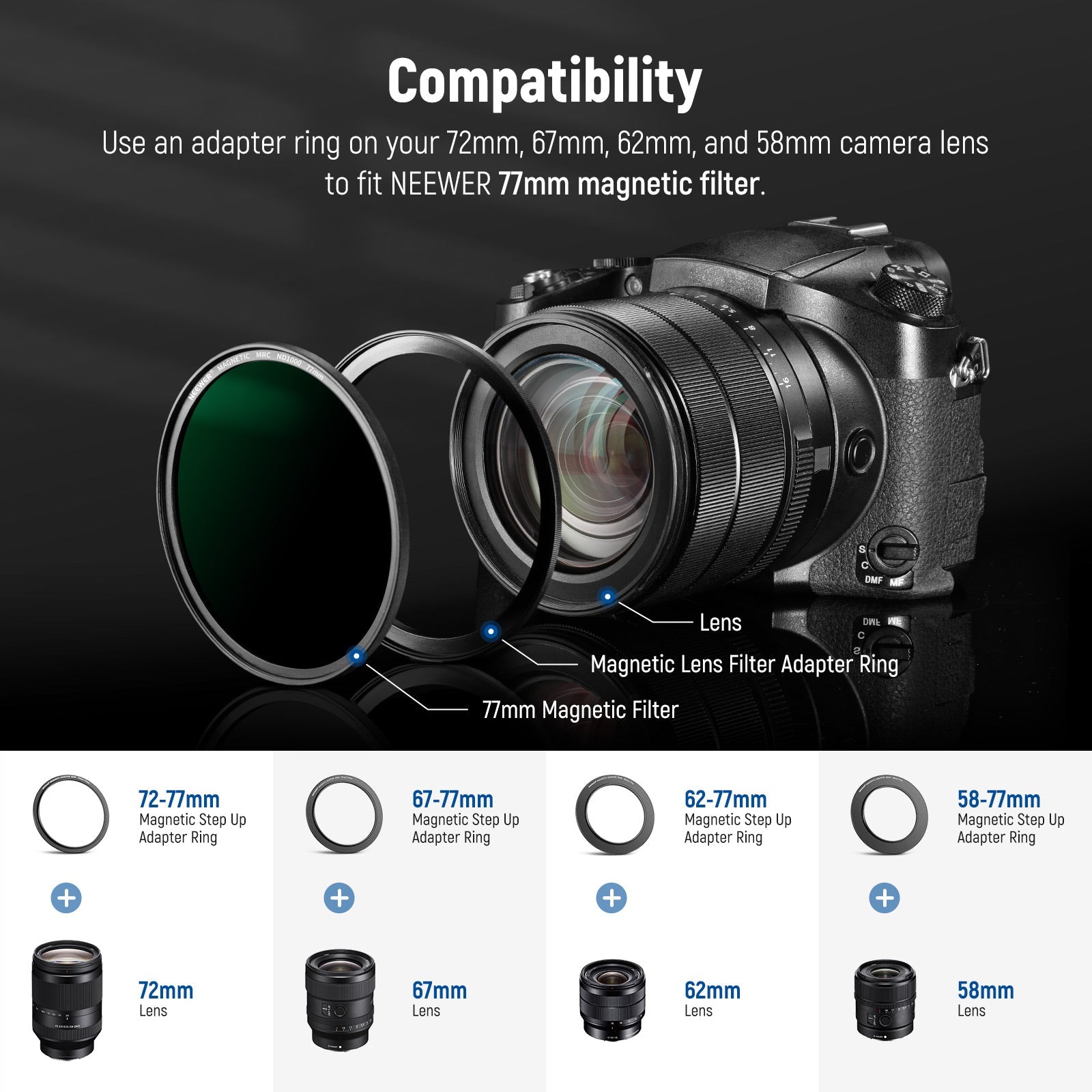 - Anello step-up magnetico: trasforma un obiettivo da 58 mm/62 mm/67 mm/72 mm in un obiettivo da 67 mm/72 mm/77 mm . Gli anelli step-up da 58 a 77 mm, da 62 a 77 mm, da 67 a 77 mm e da 72 a 77 mm consentono di utilizzare un filtro magnetico di dimensione della filettatura più grande (77 mm) su una fotocamera con dimensioni della filettatura più piccole (58 mm, 62 mm, 67 mm o 72 mm )