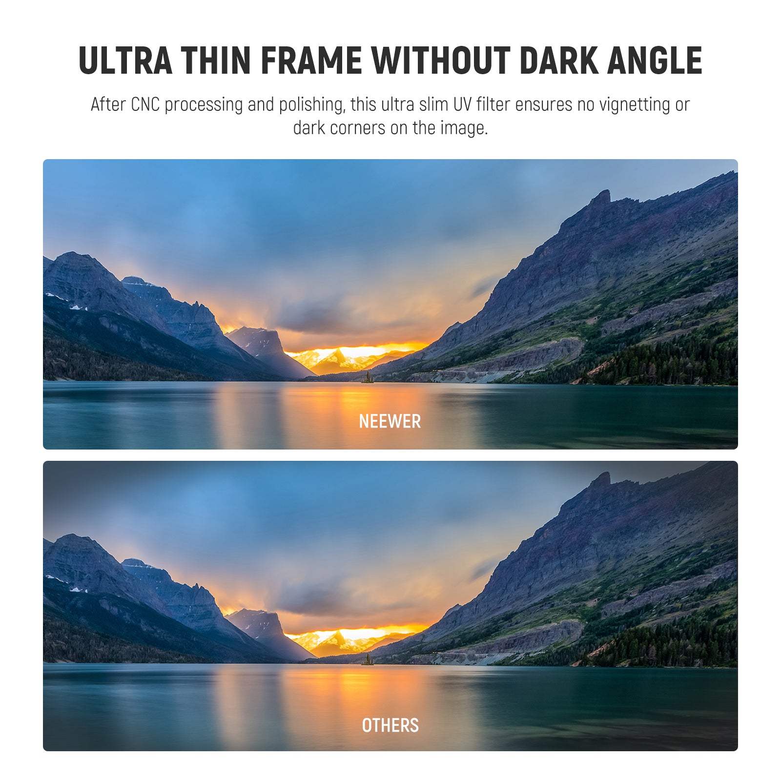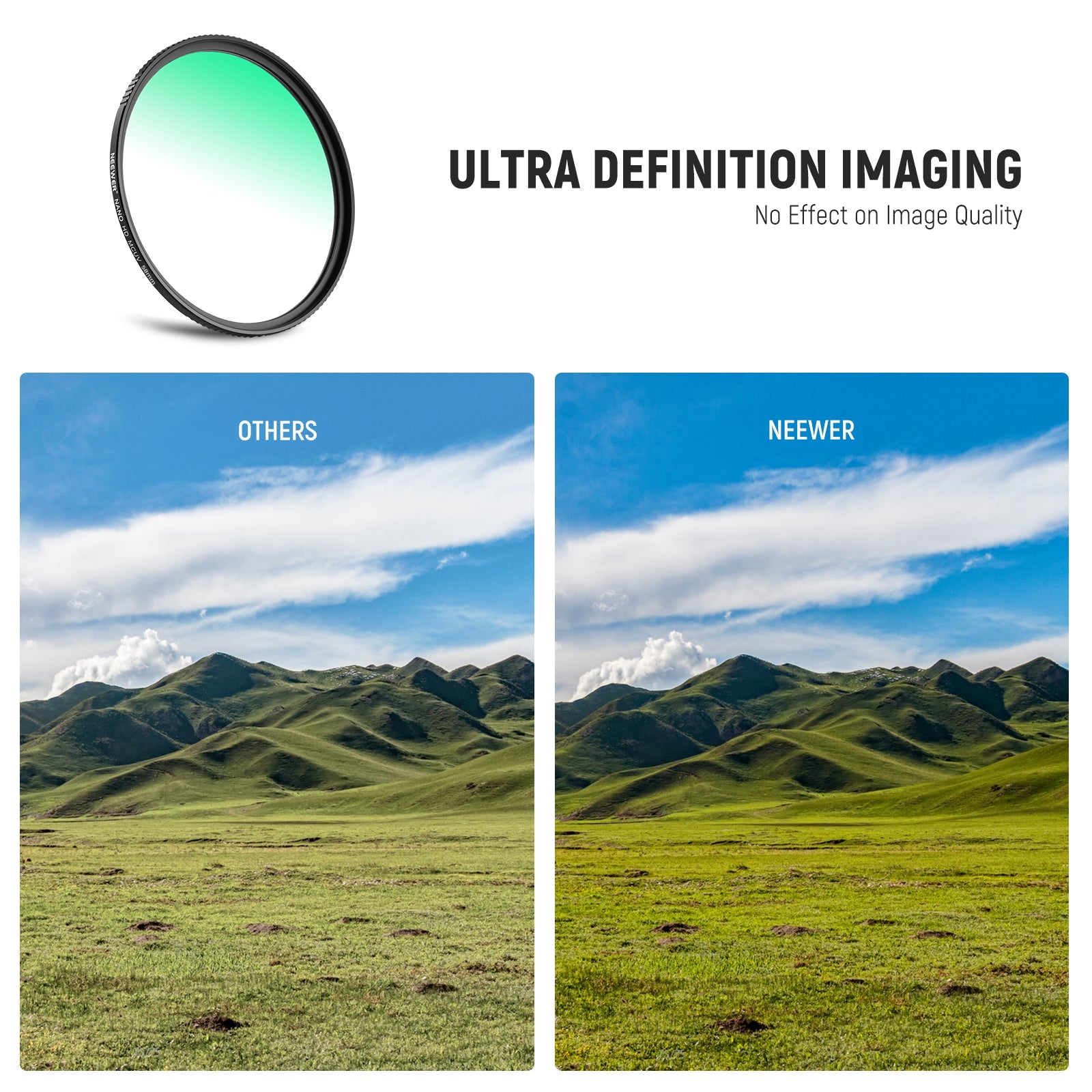 - Blocco della luce UV: questo filtro UV impedisce ai raggi ultravioletti di entrare nell'obiettivo della fotocamera ed elimina la foschia blu, soprattutto per i sensori della fotocamera meno sensibili. Un must per la fotografia di paesaggi all'aperto nelle giornate soleggiate o ad alta quota con forte luce UV, come nel deserto e in spiaggia, per offrire un effetto naturale estremamente chiaro