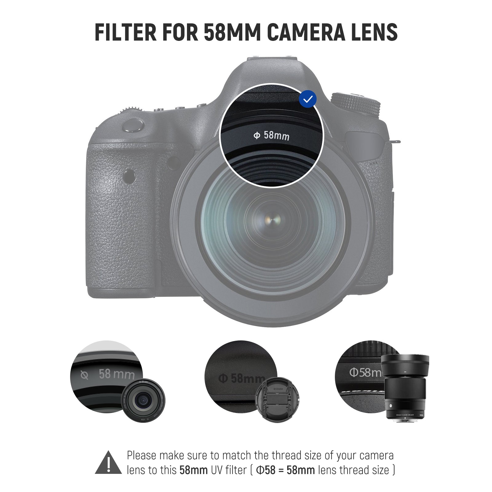 - Scegli la dimensione corretta del filtro: questa gamma di filtri UV HD è disponibile in diverse dimensioni. Ad esempio, il filtro da 58 mm può funzionare solo con un obiettivo per fotocamera da 58 mm. Assicurati di abbinare la dimensione della filettatura dell'obiettivo della fotocamera al filtro UV (Φ58 = dimensione della filettatura dell'obiettivo 58 mm). È inclusa anche una custodia per il trasporto per riporre il filtro in modo sicuro