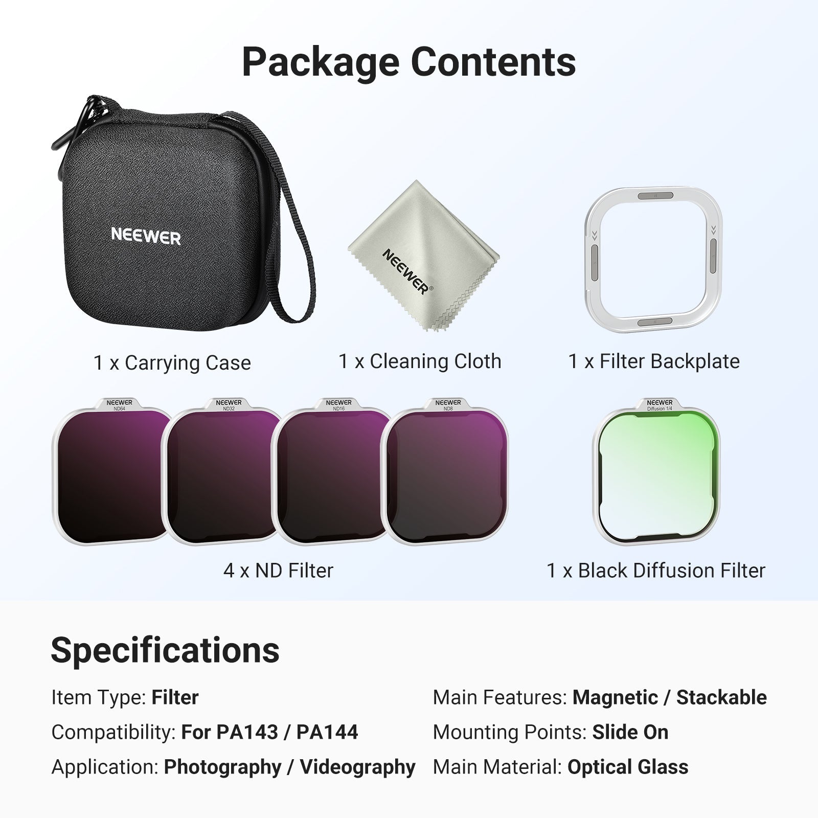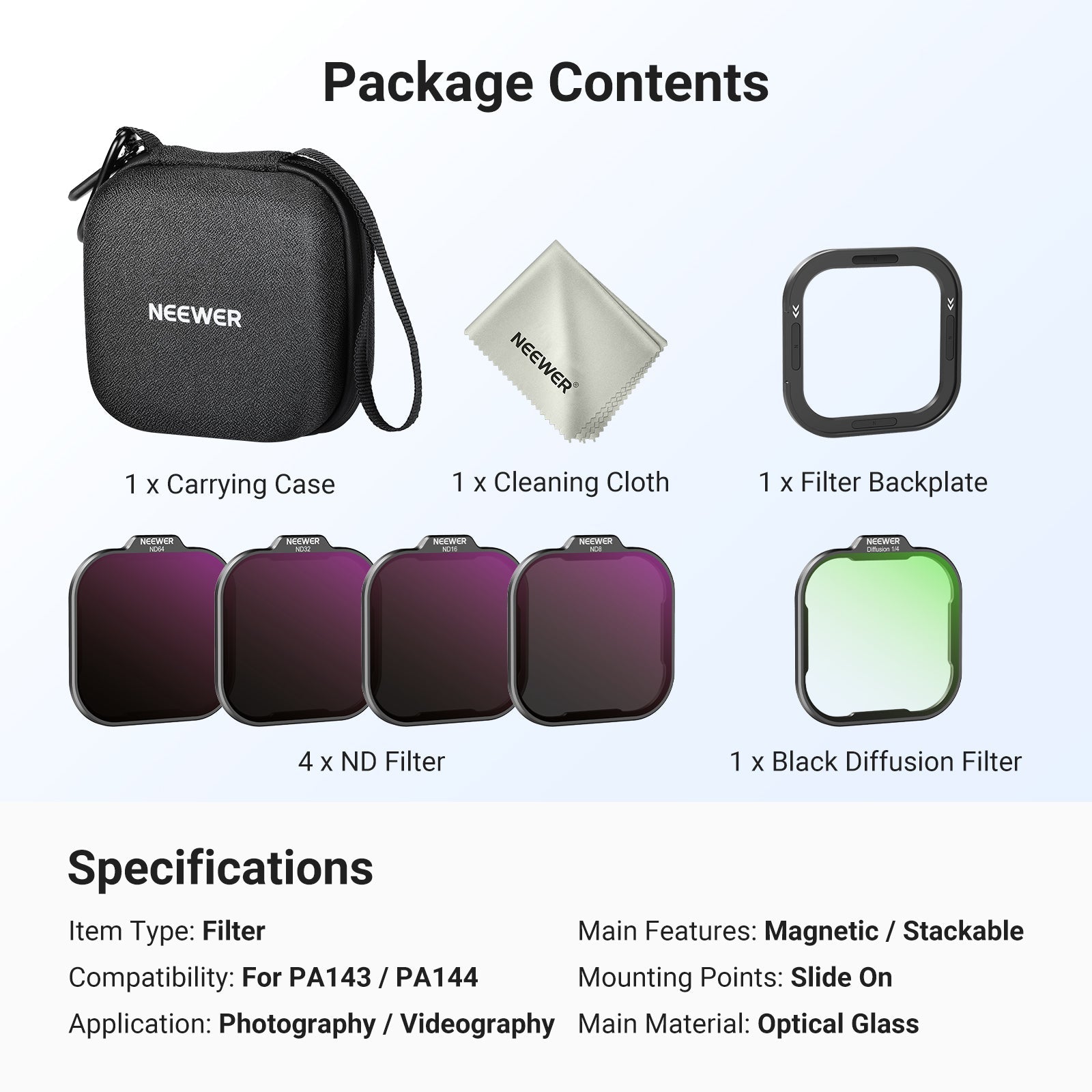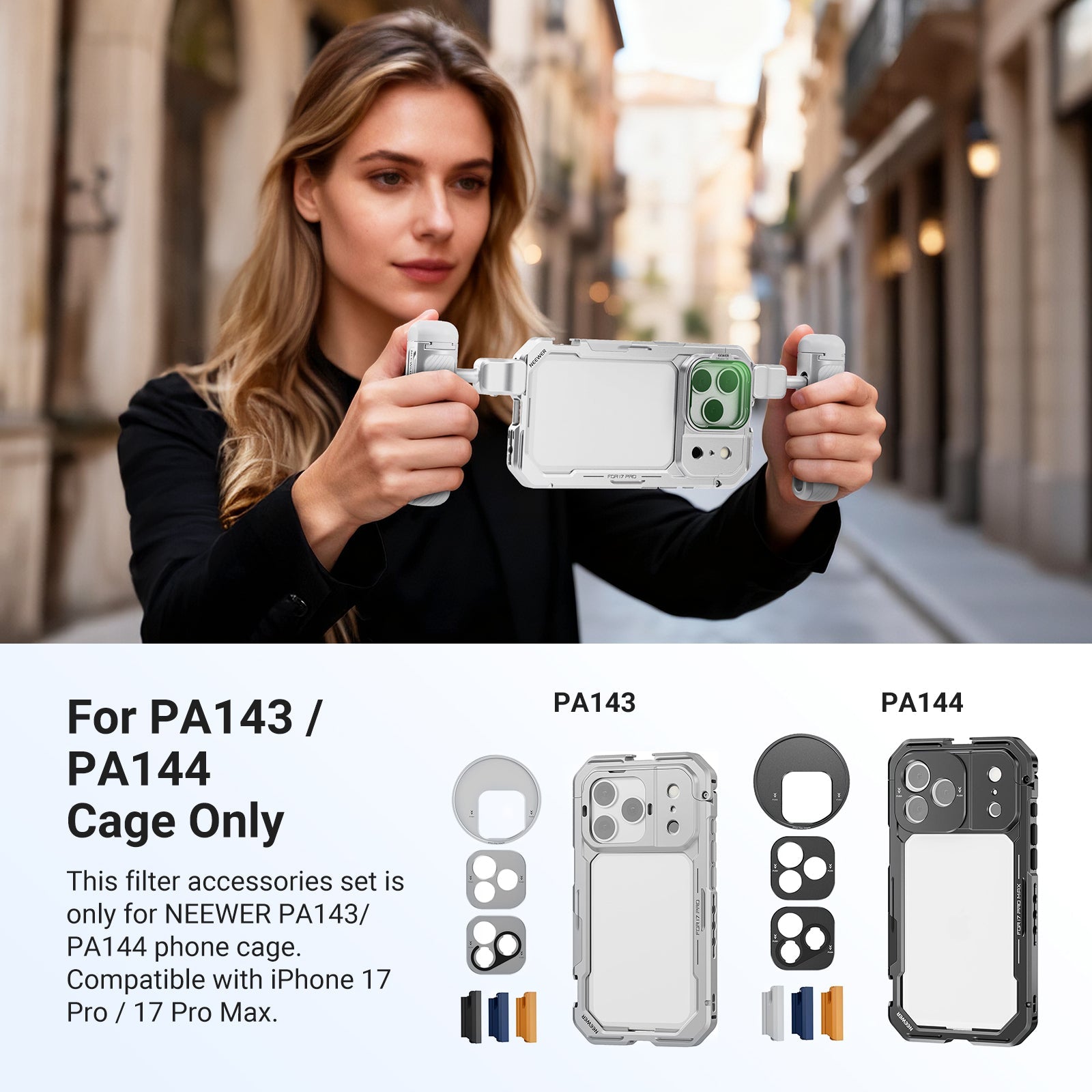 - Solo per la gabbia PA143/PA144 - Questo set di accessori per filtri è compatibile solo con la gabbia per telefono NEEWER PA143/PA144. Compatibile con iPhone 17 Pro / 17 Pro Max, in quanto elemento essenziale per i creatori di contenuti e gli influencer, i filtri per lenti della fotocamera del telefono cellulare devono essere utilizzati per la fotografia mobile, il vlogging e altro ancora.