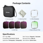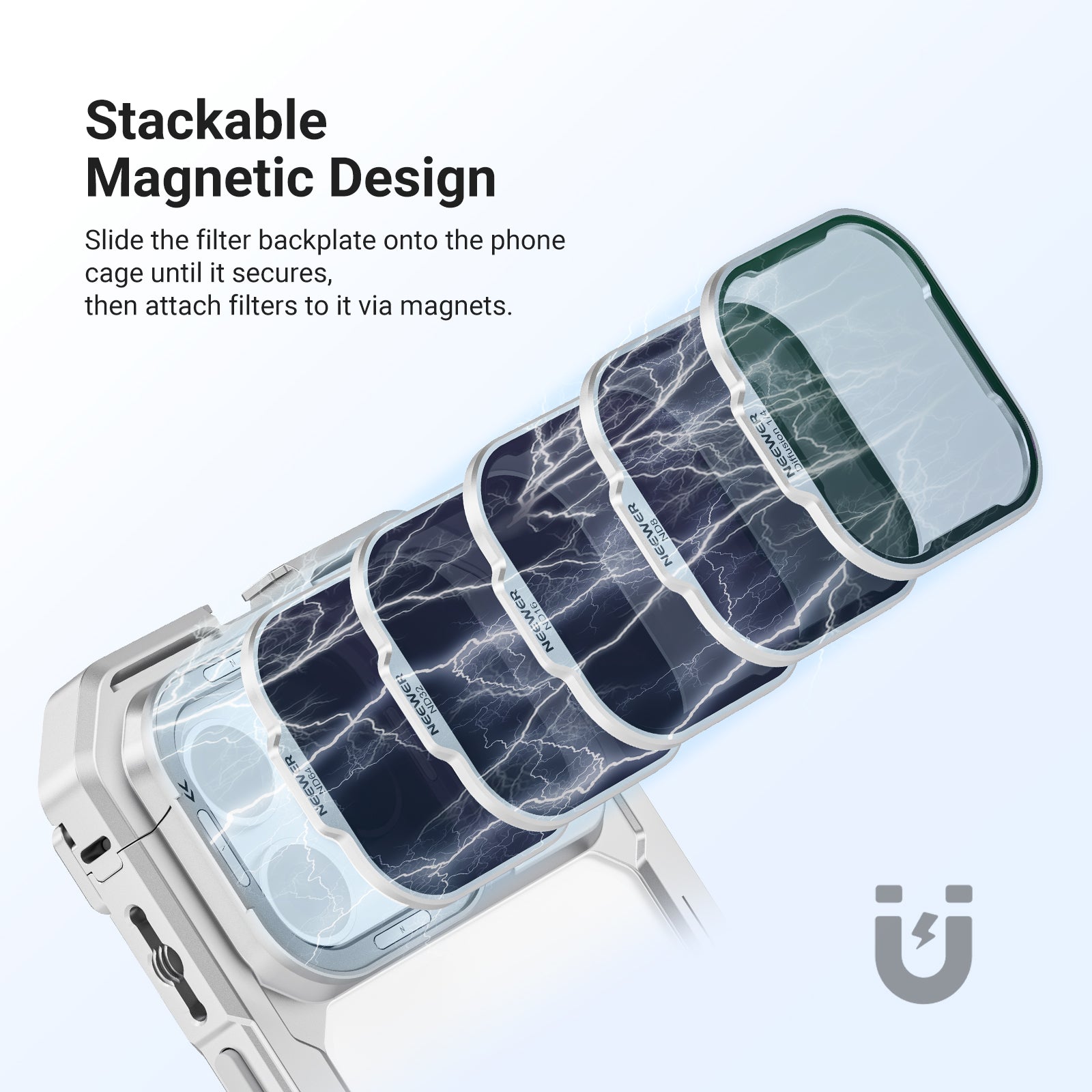 - Design magnetico impilabile : fai scorrere la piastra posteriore del filtro sulla gabbia del telefono fino a quando non si blocca, quindi fissa i filtri tramite magneti. Impila più filtri per effetti creativi. Nota: apri la staffa superiore della gabbia prima di installare la piastra posteriore.