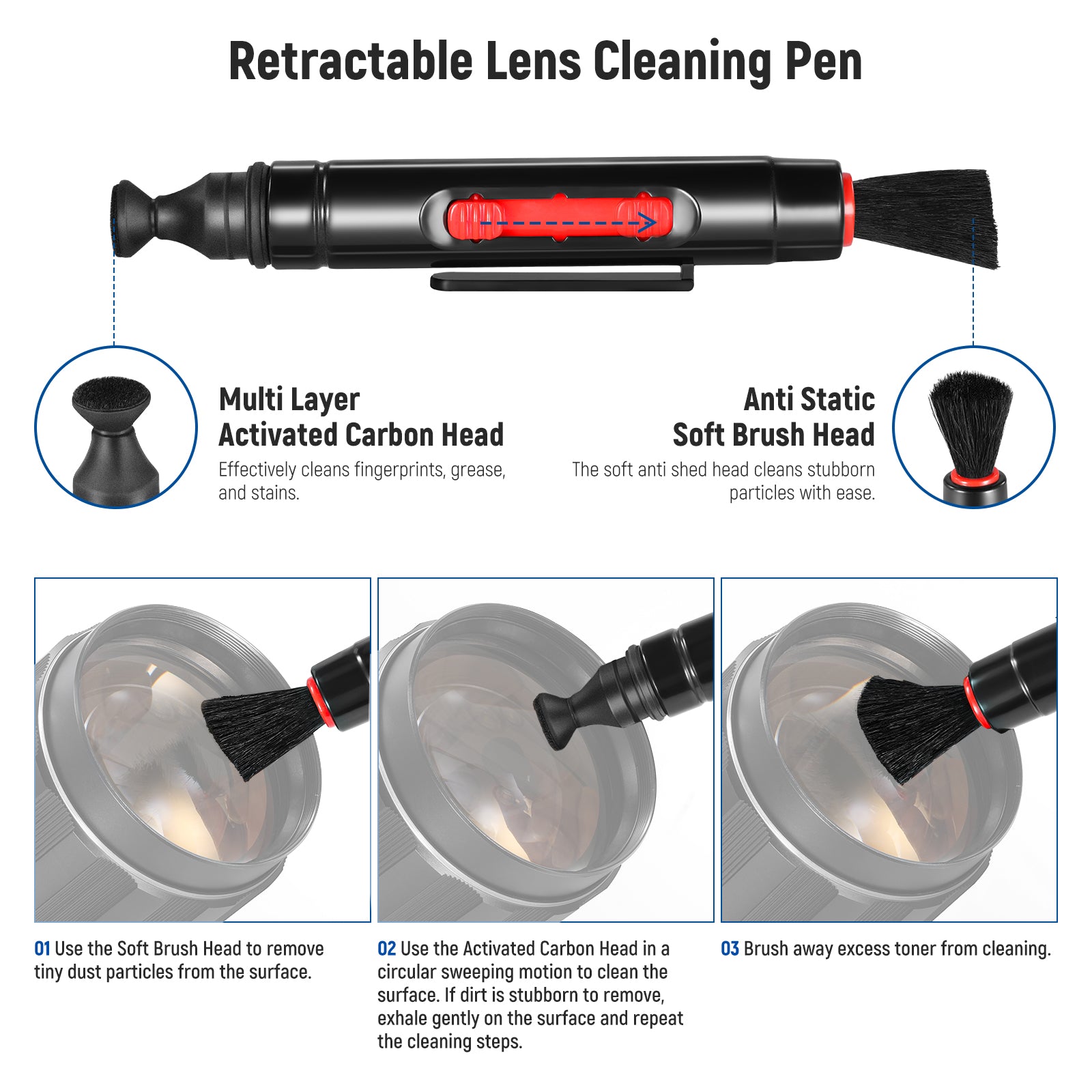 - Semplice pulizia quotidiana : una penna estensibile per la pulizia delle lenti e un panno per la pulizia ti aiutano a rimuovere facilmente polvere, detriti, impronte digitali e macchie da filtri e lenti senza graffiarli