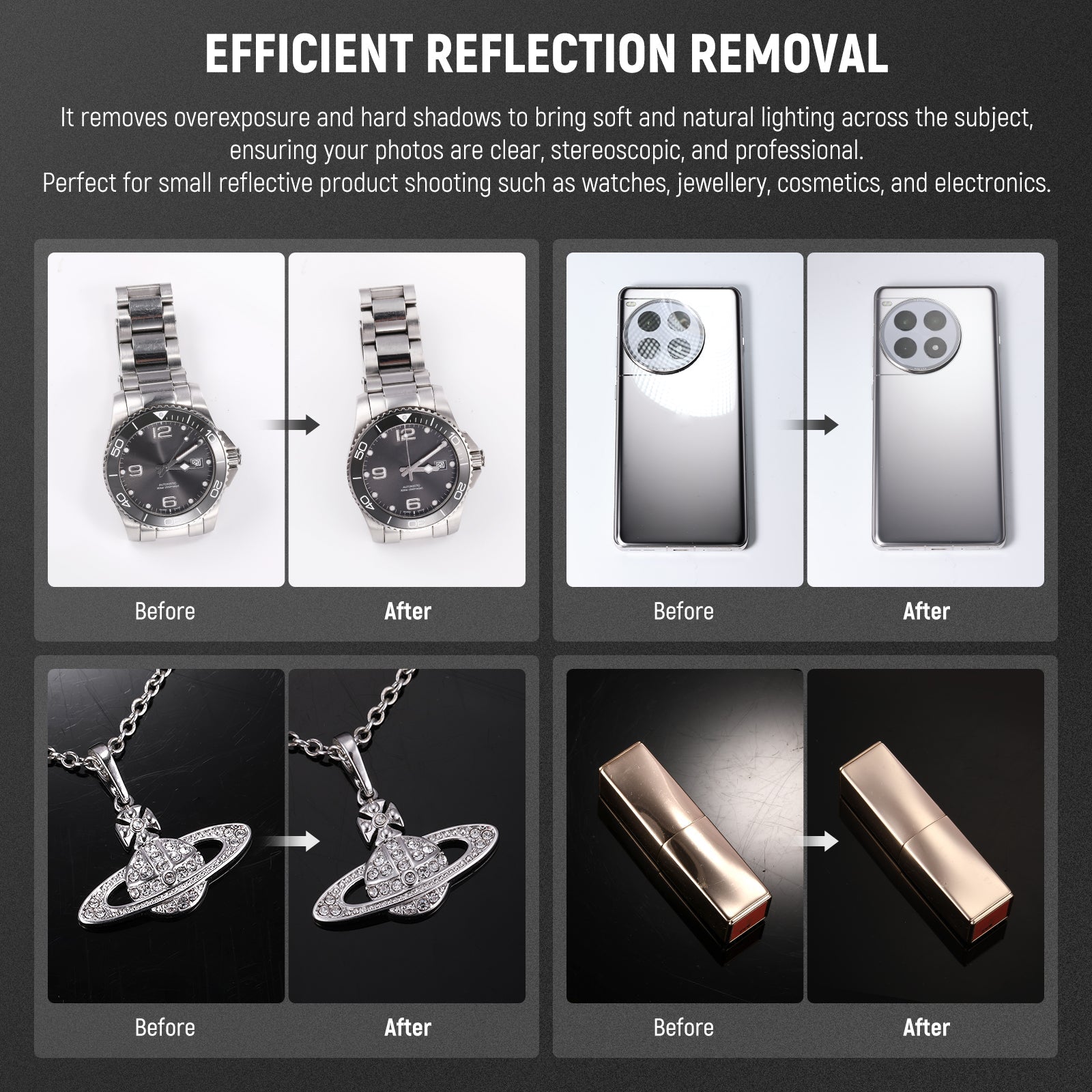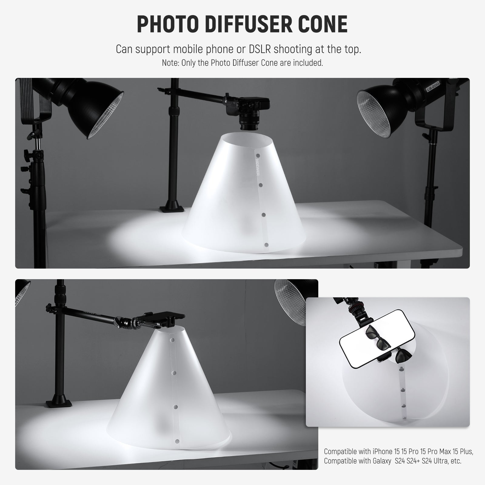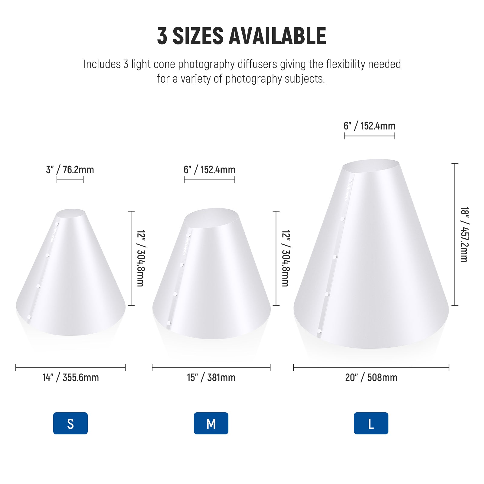 - 3 misure disponibili - 3 diffusori fotografici a cono di luce (14"/356 mm, 15"/381 mm, 20"/508 mm) offrono la flessibilità necessaria per una varietà di soggetti fotografici. Perfetti per catturare anelli, collane, gioielli, orologi, rossetti e altri piccoli oggetti personali riflettenti, applicati anche a prodotti domestici riflettenti come rubinetti, docce, bollitori, tostapane e asciugacapelli. Anche il cono più piccolo è compatibile con iPhone 15 per creare una perfetta esposizione dei tuoi prodotti
