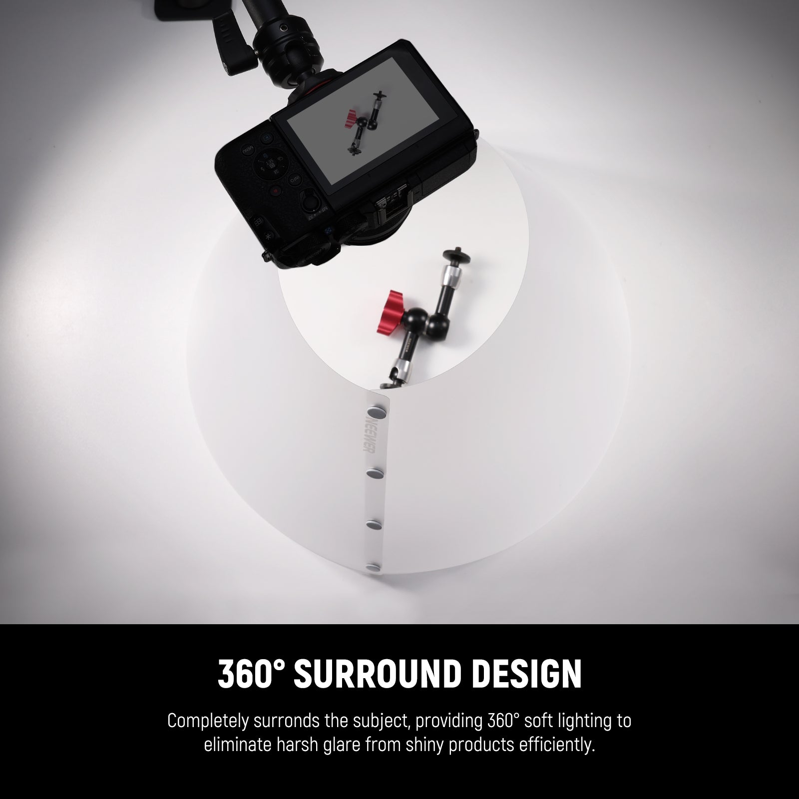 - Design del cono di luce a 360° - Il cono di luce a 360 gradi circonda il soggetto, fornendo una regolazione dell'illuminazione morbida a 360° per eliminare efficacemente i riflessi intensi dei prodotti lucidi. L'apertura superiore inclinata consente di scattare facilmente e offre angoli diversificati per catturare gli scatti migliori dei soggetti