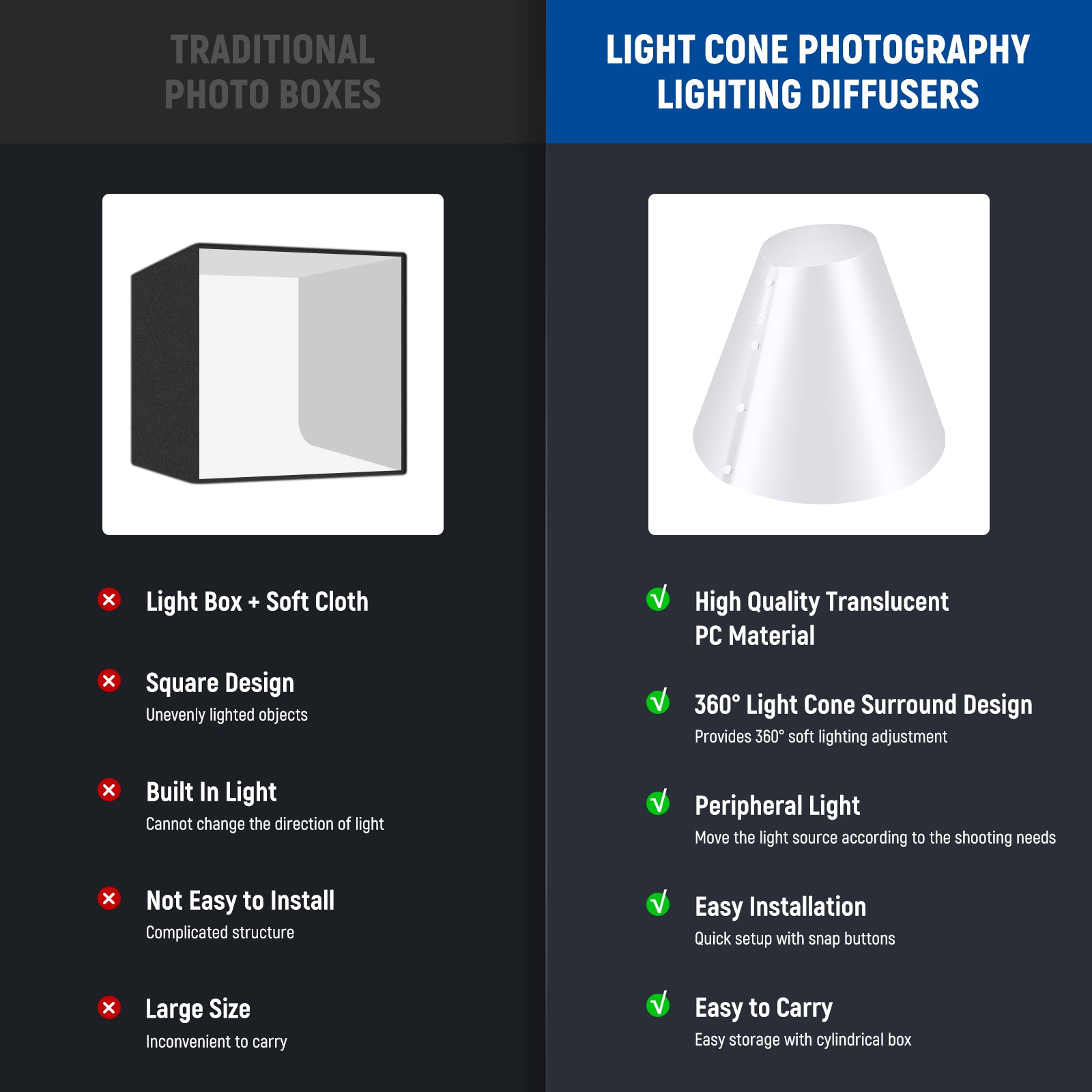 - Nuova alternativa per una rimozione efficiente dei riflessi - Realizzato in materiale PC di alta qualità con un colore traslucido, il cono diffusore fotografico NEEWER, una nuova alternativa di tendenza alle tradizionali scatole fotografiche, diffonde uniformemente la forte luce del flash per ridurre la sovraesposizione e le ombre dure sull'oggetto. Crea un'illuminazione più morbida e naturale sul soggetto per garantire che le tue fotografie siano nitide, stereoscopiche e professionali