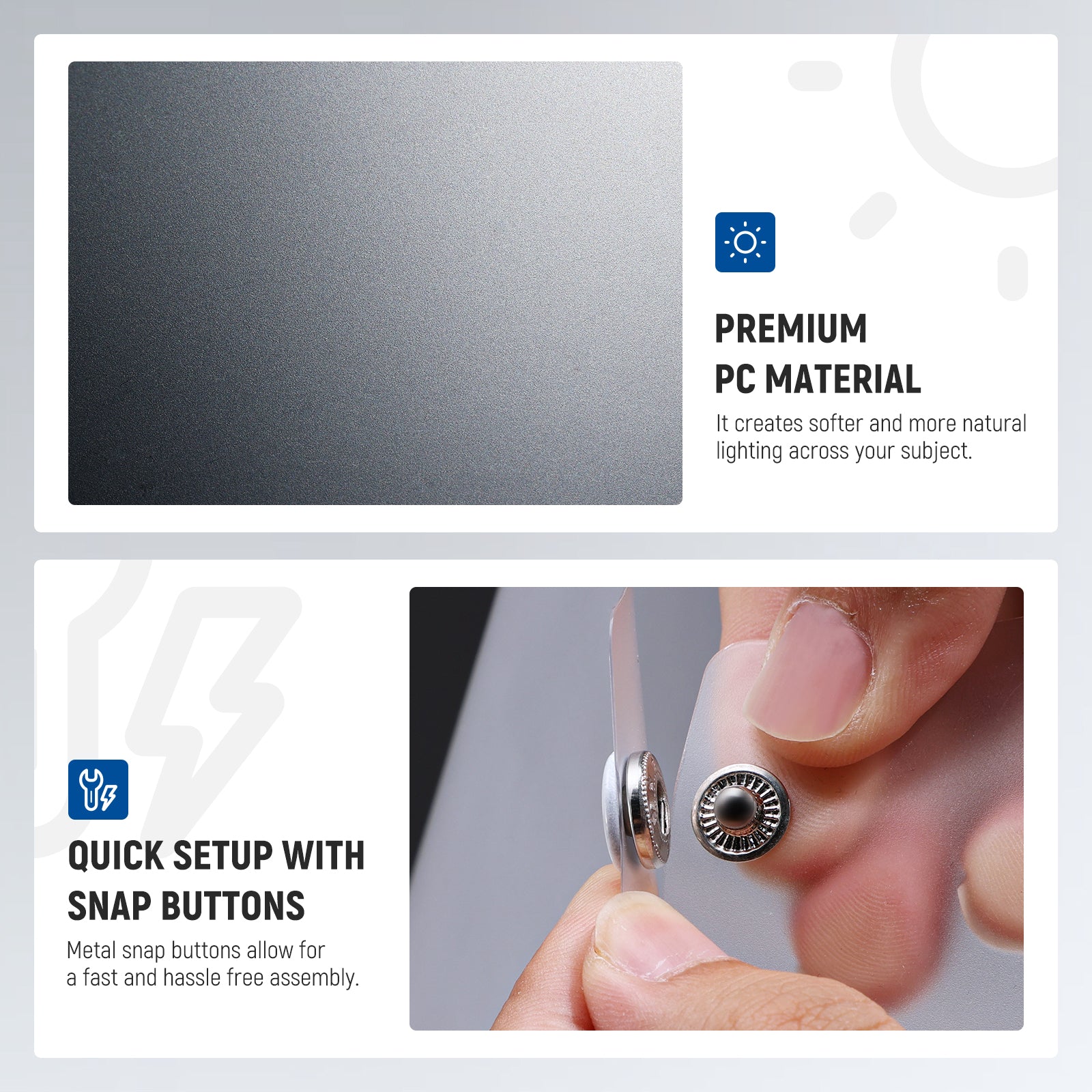 - Configurazione rapida con pulsanti a scatto : i pulsanti a scatto in metallo consentono un montaggio rapido e senza problemi, consentendo di configurare rapidamente e iniziare a scattare senza ritardi