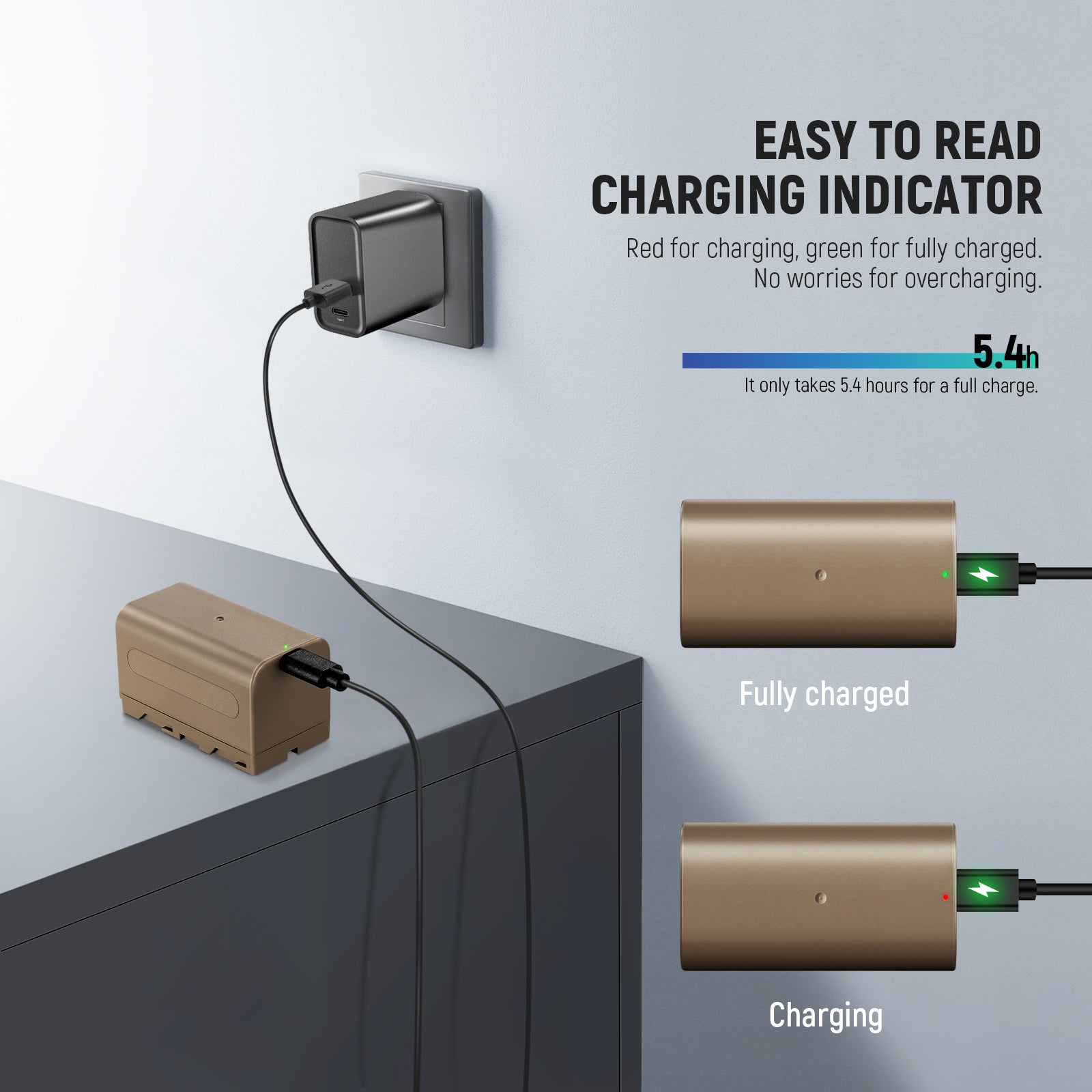 - Velocità di ricarica completa più rapida : questa batteria NP-F può essere caricata completamente in 5,4 ore con un caricabatterie da muro USB da 5 V 2 A, molto più veloce di 27 ore quando si utilizza il caricabatterie originale. Nota: la ricarica rapida PD non è supportata, l'adattatore per caricatore da muro non è incluso