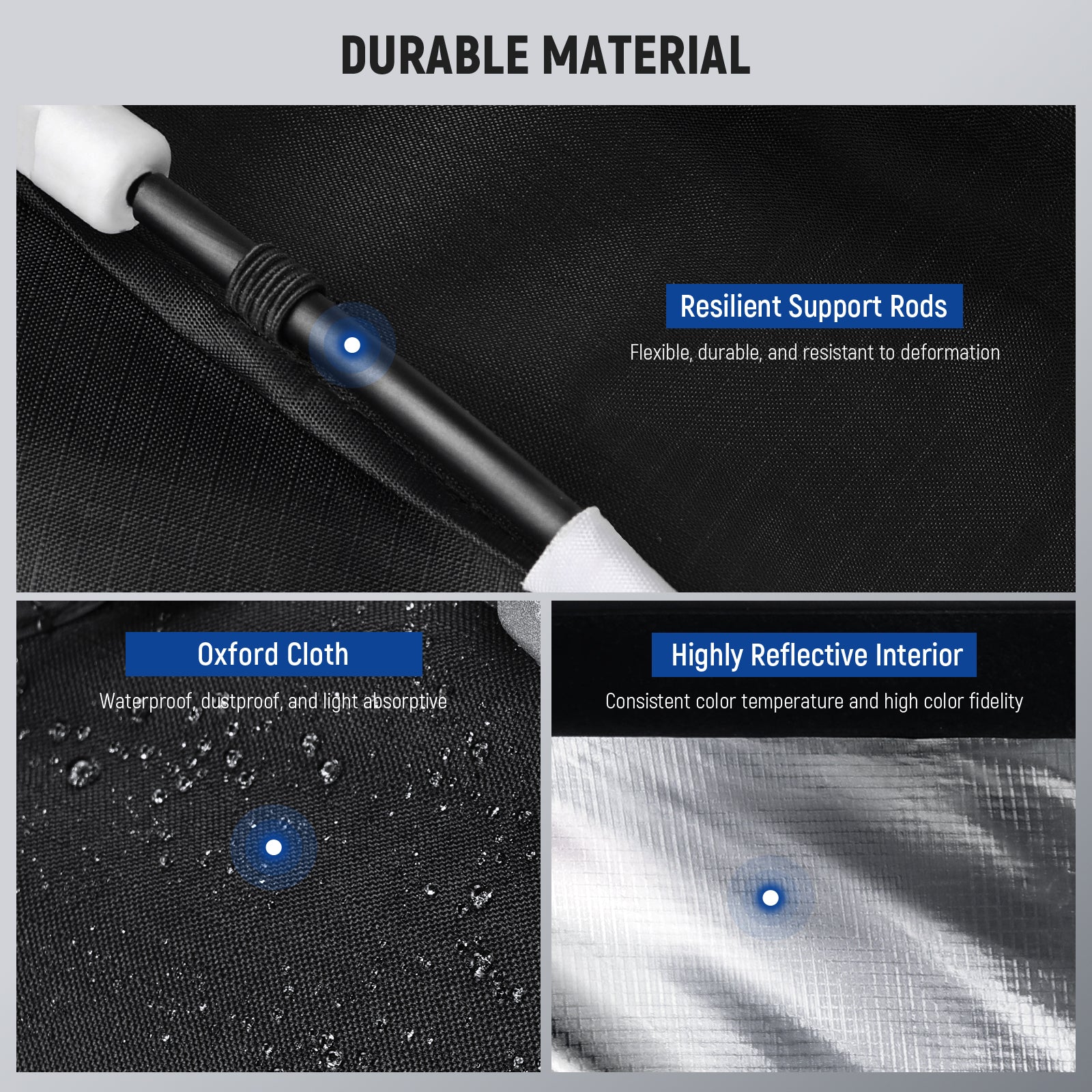 - Softbox piccolo quadrato portatile : questo softbox relativamente mini da 15,7"x15,7"/40 x 40 cm presenta un rivestimento argentato lucido che amplia e diffonde l'output mantenendo l'indice di resa cromatica (CRI) e la temperatura del colore neutri. La distribuzione uniforme della luce può ridurre al minimo le imperfezioni e le ombre, levigare la pelle e definire le strutture del viso