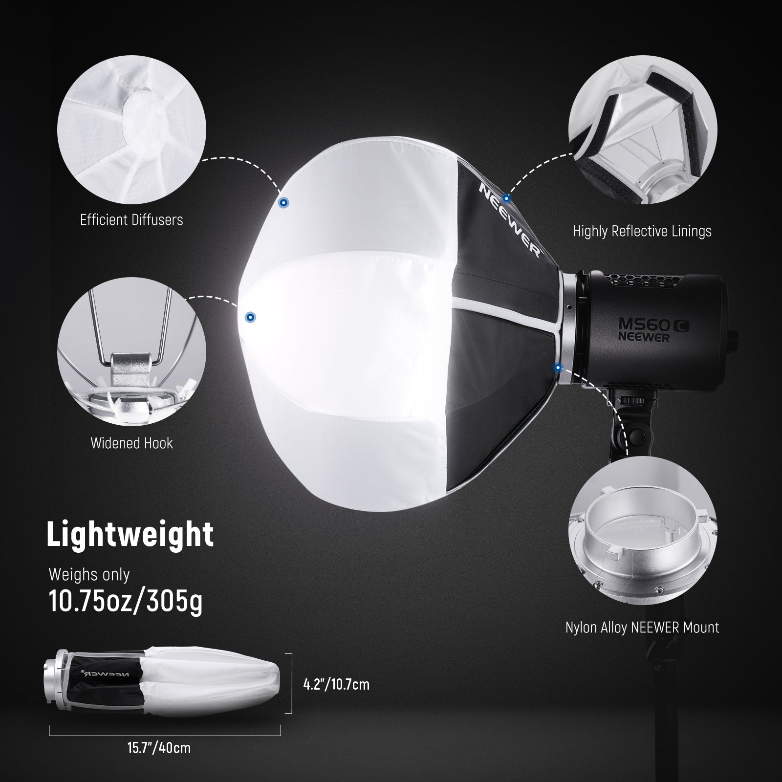 - One Step Quick Release & Fold - Progettato con una struttura integrata, il softbox consente l'apertura e la chiusura immediata con un solo semplice passaggio. Si piega anche a 4,2"x4,2"x 15,7"/107x107x400mm e si adatta all'interno della borsa di stoccaggio per un facile trasporto. Goditi un controllo dell'illuminazione senza interruzioni a portata di mano, risparmiando tempo e fatica. È un'alternativa più comoda ed efficiente alle versioni tradizionali