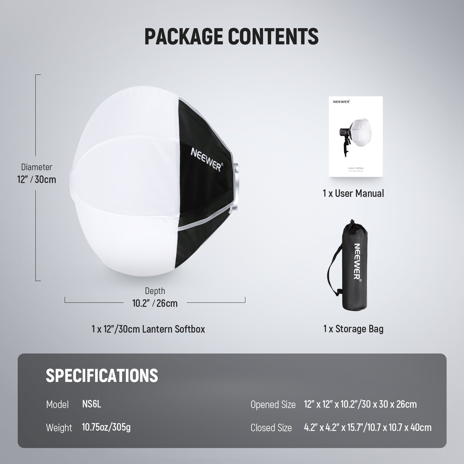 - Lanterna Softbox con attacco NEEWER - Questa lanterna softbox da 12"/30cm è compatibile solo con le mini luci video LED NEEWER MS60 MS60B MS60C MS150B. Le sue dimensioni compatte la rendono la scelta ideale per configurazioni di illuminazione soft portatili in movimento all'aperto, consentendo rapidi cambi tra i modificatori di luce NEEWER e altri accessori con adattatori di attacco NEEWER (NOTA: non è compatibile con la luce di attacco Bowens).