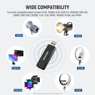 - Compatibilità con il sistema operativo : il trasmettitore Bluetooth è compatibile con Windows 7, Windows 10, macOS 10.14 e versioni successive. ?Le luci attualmente compatibili includono GL25C, HS60B, SL90, SL90 Pro, RGB1200, RGB C80, CB60B, CB60 RGB, CB200B, TL40, TL60, GR18C, AS600B, RL45B e RP19H. Altre luci compatibili saranno disponibili a breve