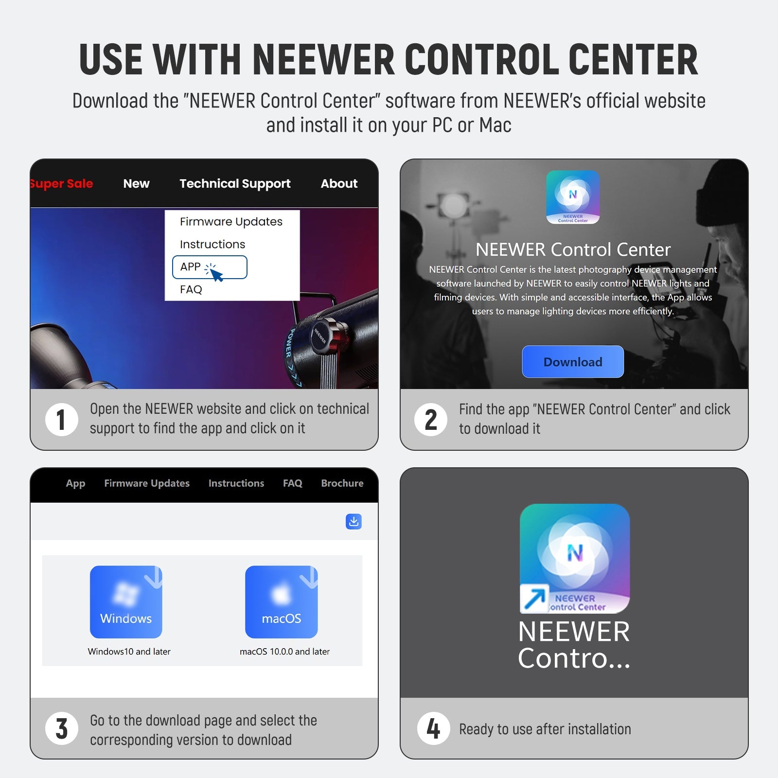 - Utilizzo con NEEWER Control Center - Scarica il software "NEEWER Control Center" dal sito Web ufficiale di NEEWER e installalo sul tuo PC o Mac, quindi puoi utilizzare il software per controllare facilmente l'illuminazione sul tuo computer con pochi clic del mouse