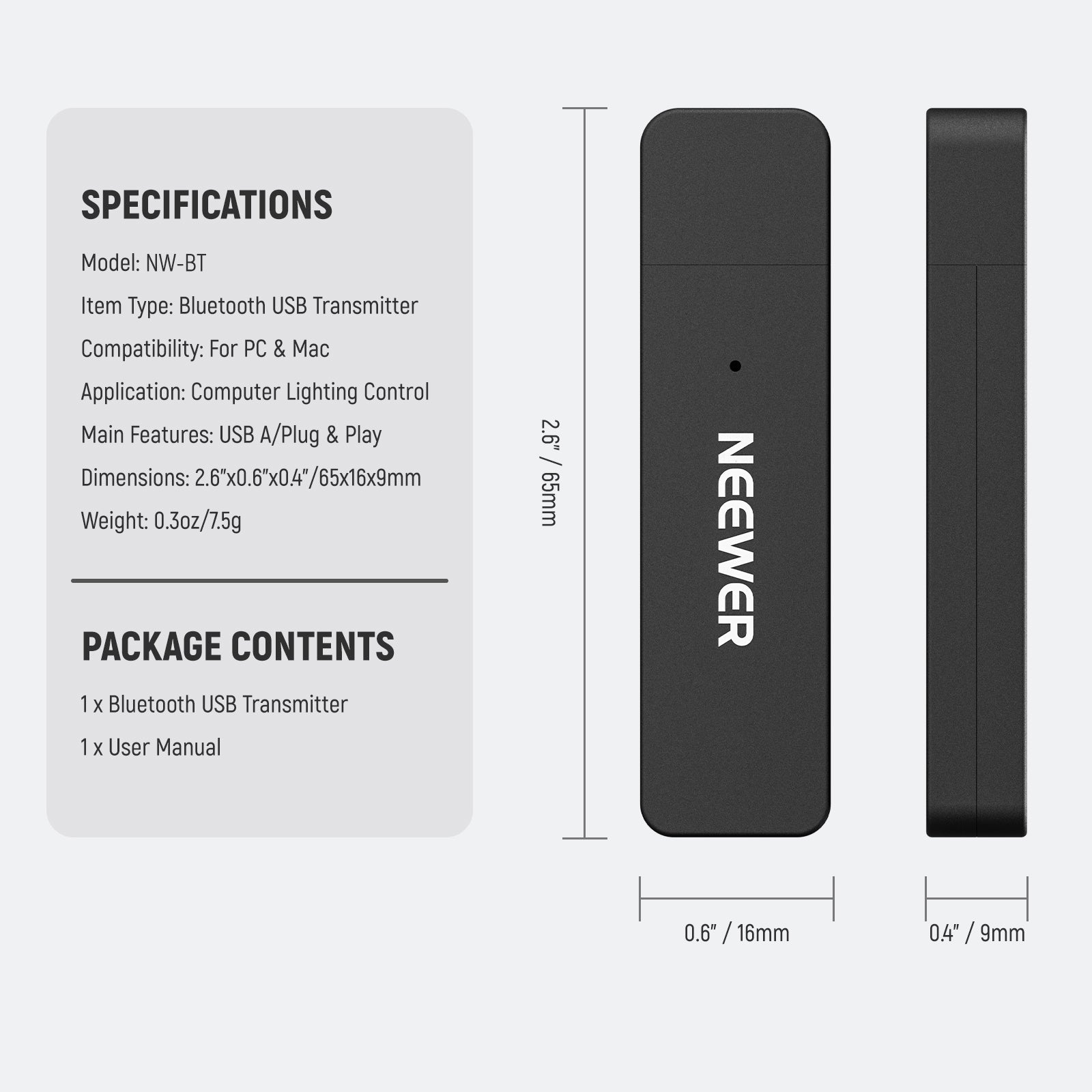 - Trasmettitore Bluetooth per PC e Mac : questo trasmettitore Bluetooth può trasformare il tuo computer in un telecomando per le luci video LED Bluetooth e le luci ad anello NEEWER (tranne RGB1 e RGB2), ideale per giocatori, tutor online e partecipanti alle riunioni Zoom che hanno bisogno di concentrarsi sui loro monitor.