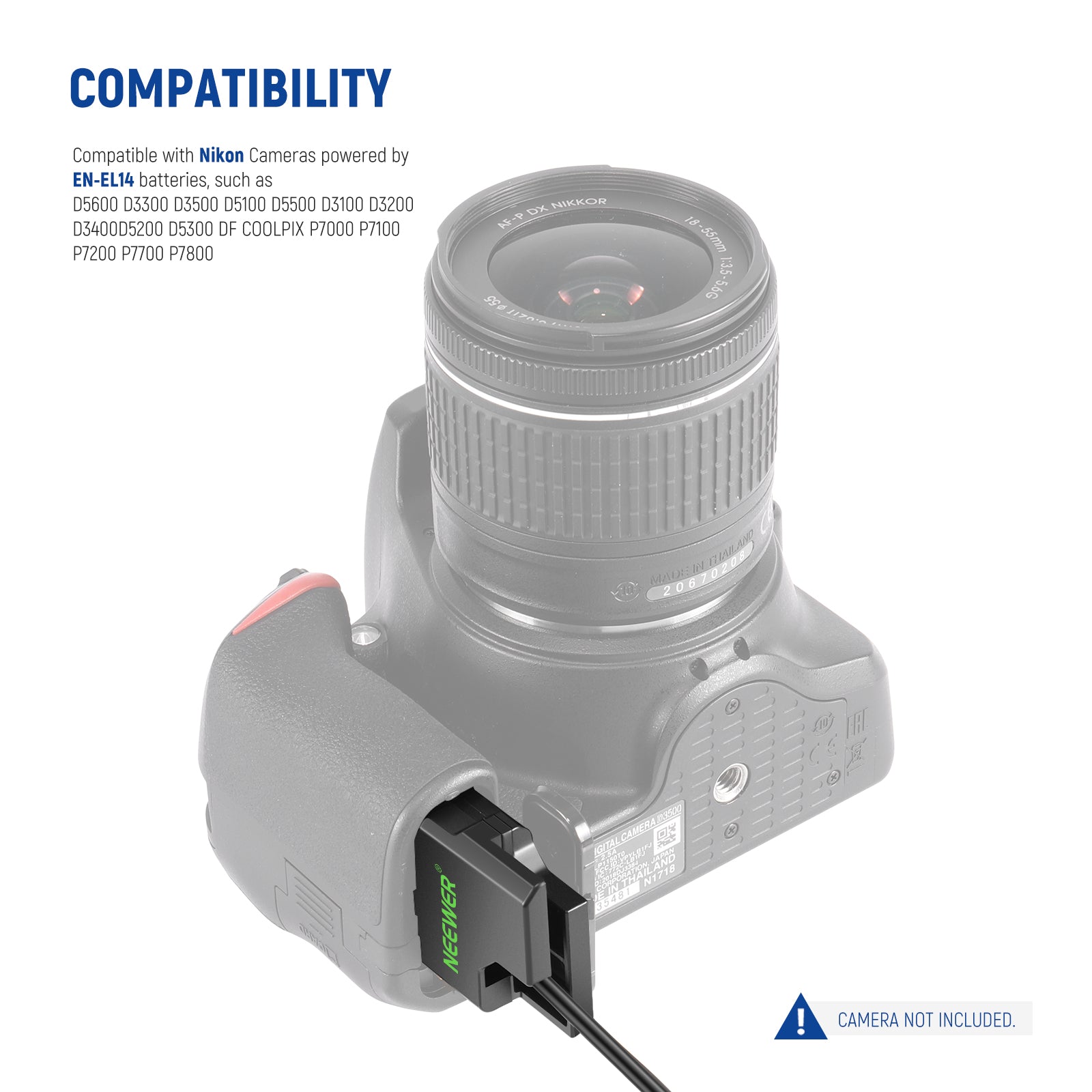 - Alimentatore sostitutivo per batteria EN-EL14: questo set caricabatteria è un alimentatore sostitutivo per batteria fittizia accoppiatore per batteria EN-EL14, compatibile con le fotocamere Nikon D5600 D3300 D3500 D5100 D5500 D3100 D3200 D3400 D5200 D5300 DF Coolpix P7000 P7100 P7200 P7700 P7800