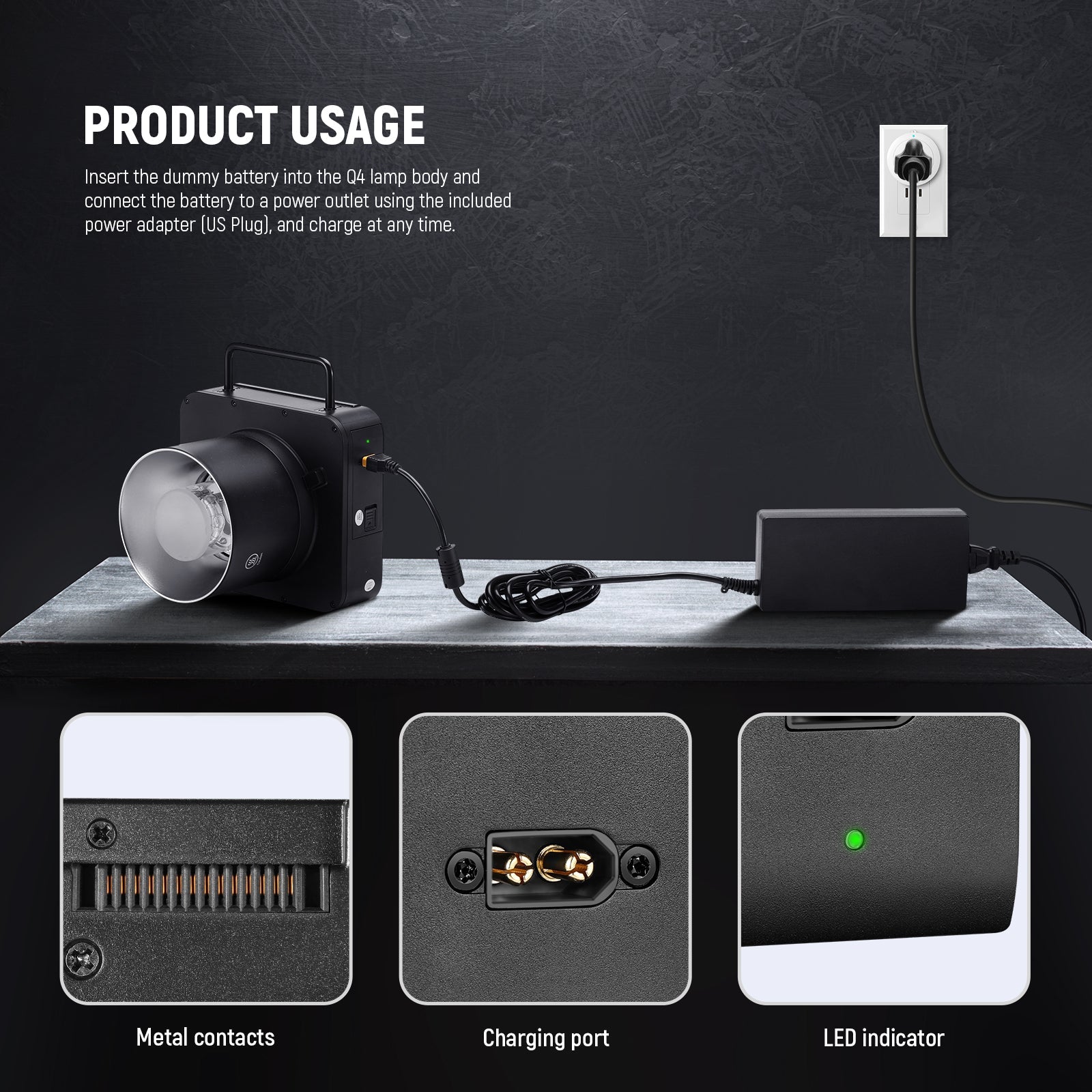 - Utilizzo del prodotto : inserire la batteria fittizia nel corpo della lampada Q4 e collegare la batteria a una presa di corrente utilizzando l'adattatore di alimentazione incluso (spina statunitense) e caricare in qualsiasi momento