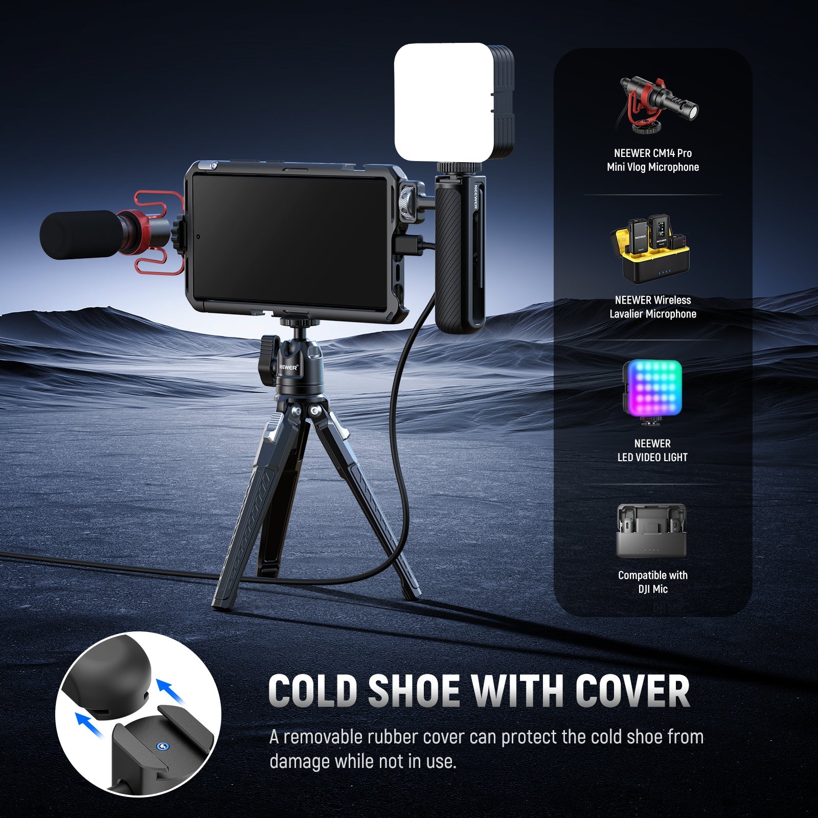 • Slitta fredda con perno e copertura anti-off - La slitta fredda integrata può collegare il microfono NEEWER CM14 Pro, il microfono lavalier wireless CM22/CM28, la luce video LED PL81/RGB61/RGB62 ed è compatibile con DJI Mic. Una copertura in gomma rimovibile può proteggere la scarpa fredda da eventuali danni. Un perno anti-sgancio retrattile caricato a molla può impedire che l'accessorio montato scivoli via