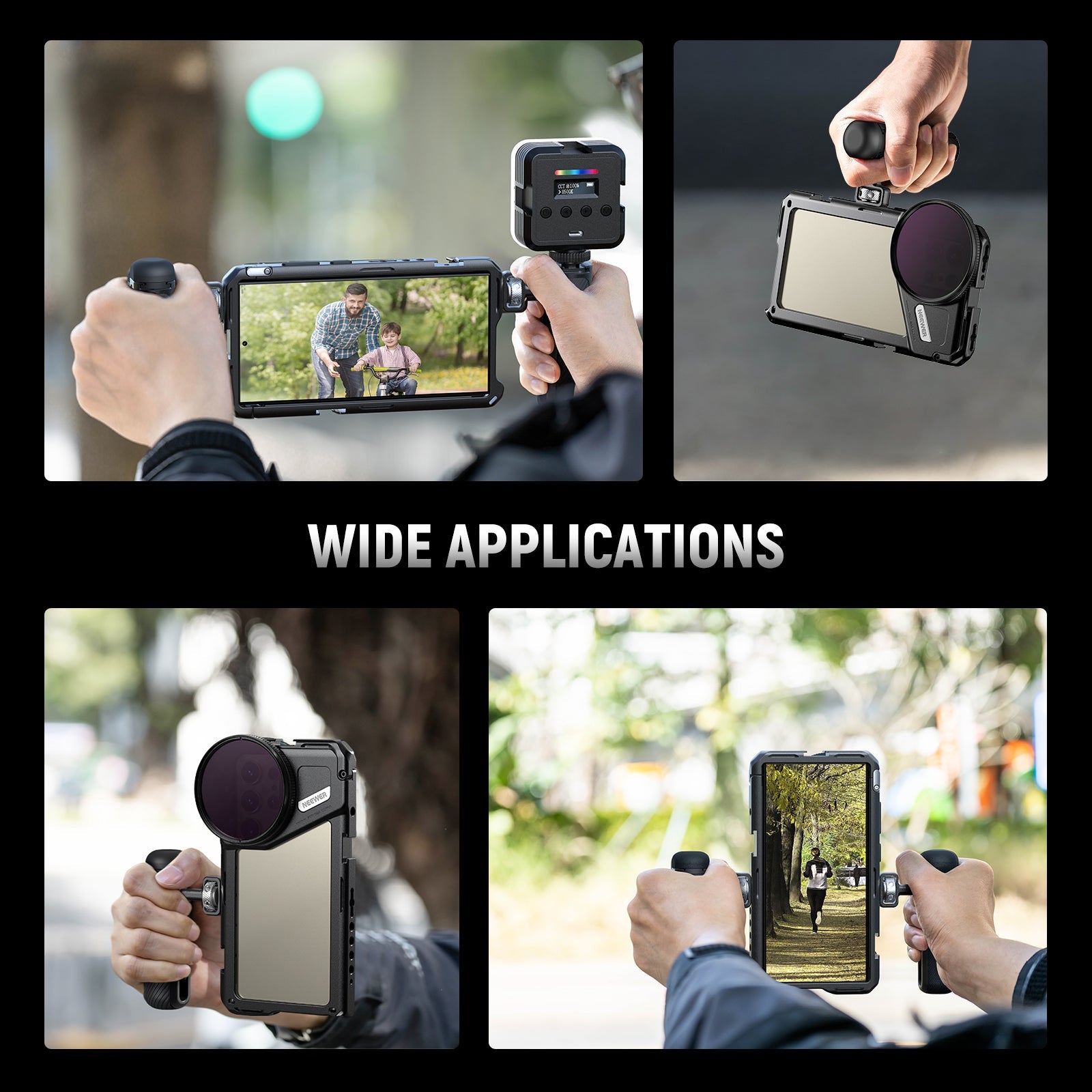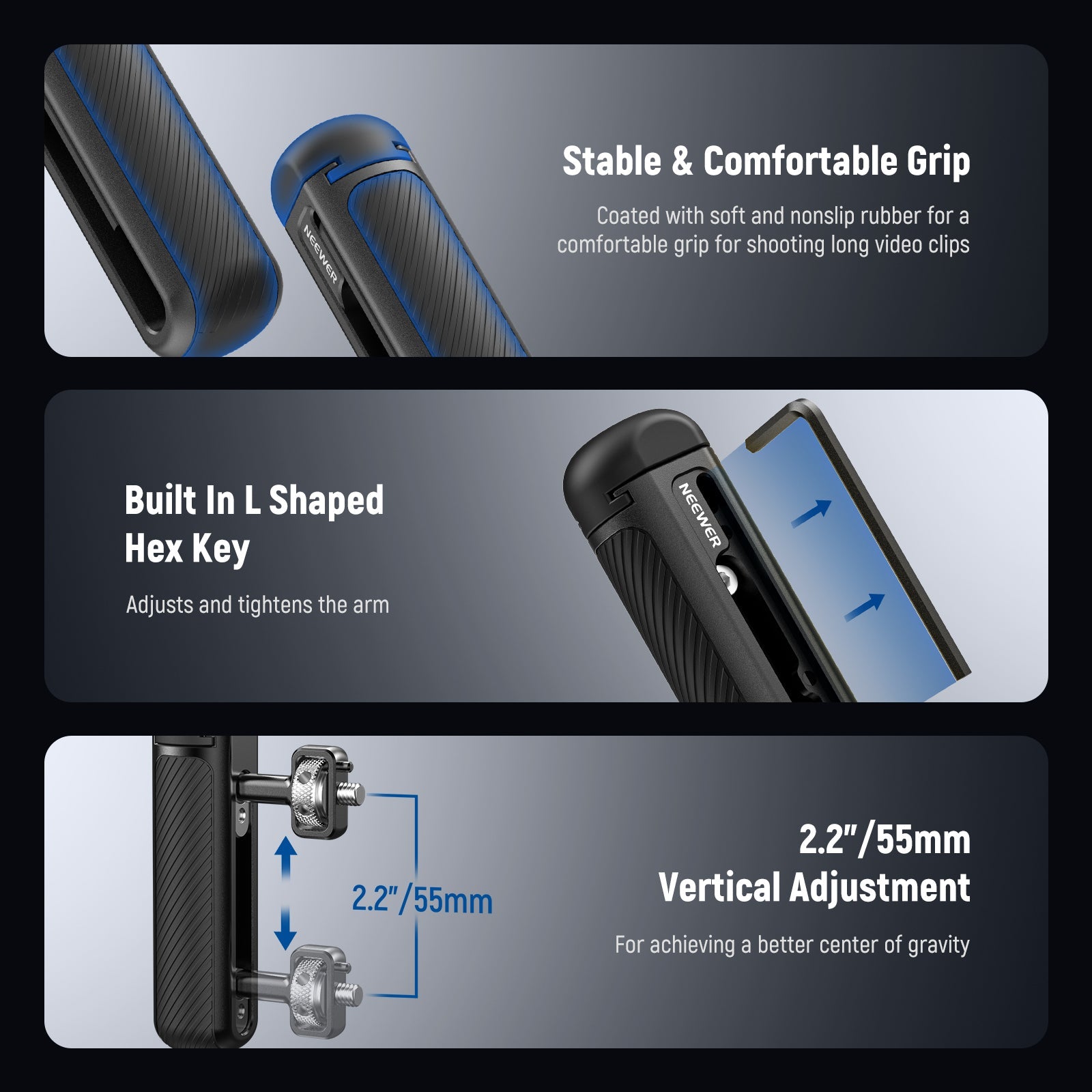 • Rotazione a 360° e regolazione verticale - L'impugnatura del telefono ruotabile a 360° può funzionare come maniglia laterale o come maniglia superiore per riprese ad angolo basso. Supporta la regolazione verticale di 2,2"/55 mm per bilanciare il centro di gravità