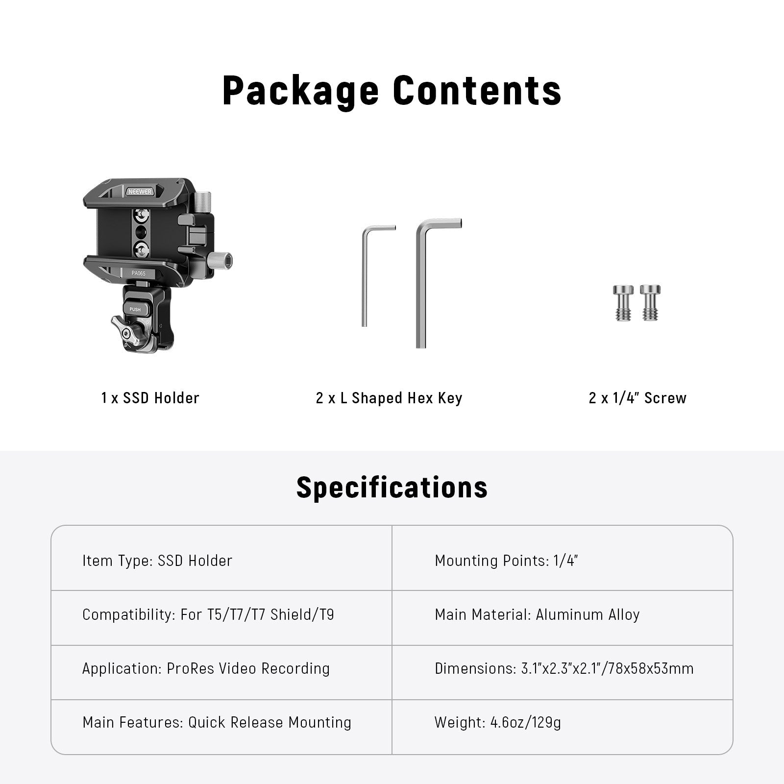 - Tre posizioni di installazione SSD - Il morsetto a sgancio rapido supporta direzioni di montaggio orizzontali e verticali (per il montaggio verticale, staccare il morsetto a sgancio rapido, quindi riattaccarlo al lato del supporto SSD). Utilizzare le due viti da 1/4" incluse per fissare il supporto SSD a una gabbia universale per telefono (NEEWER PA009/PA017). Compatibile anche con le gabbie per telefono SmallRig