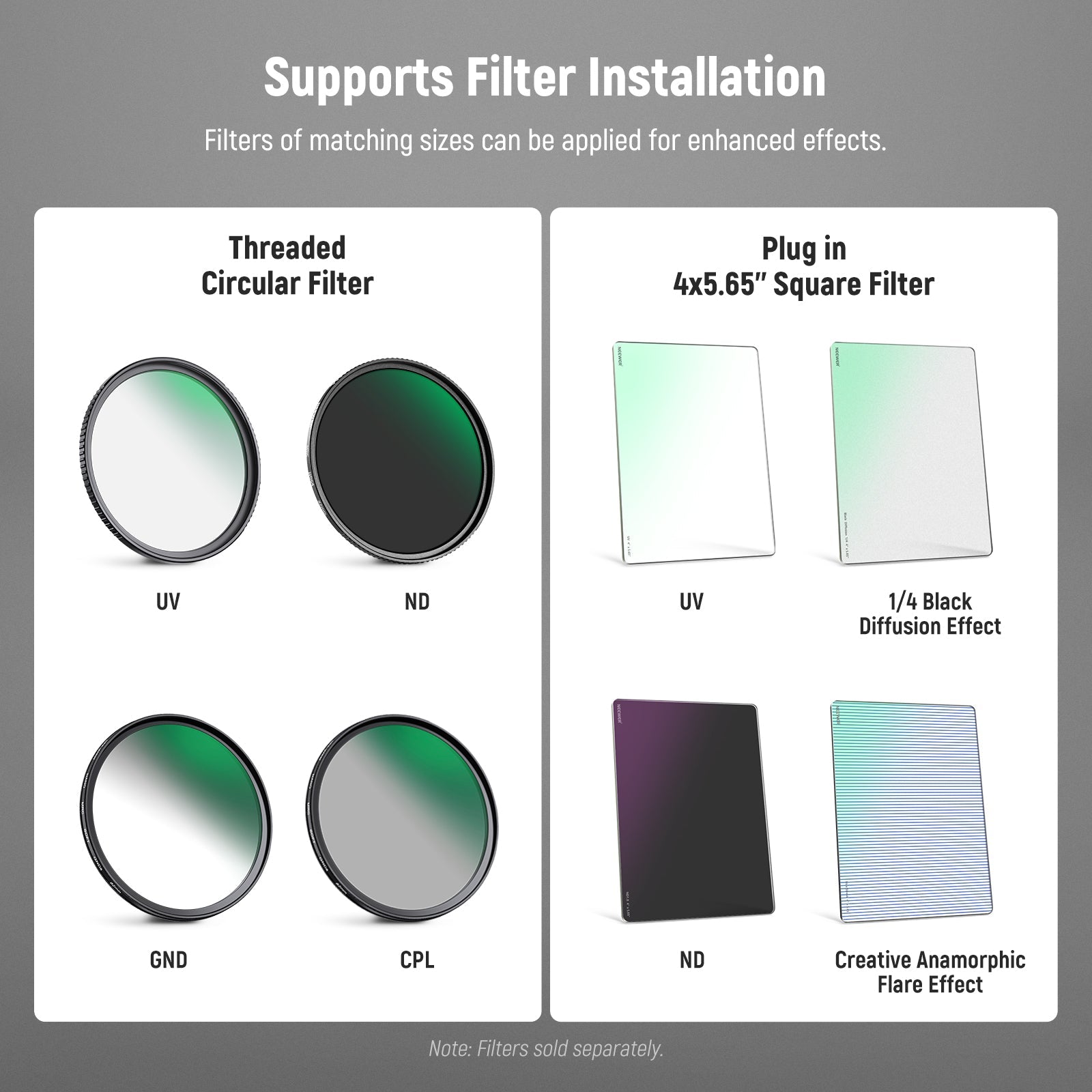 - Vassoio filtro standard da 4" x 5,65" - Il vassoio filtro incluso si adatta a filtri rettangolari da 4"x5,65" (non inclusi). I filtri (venduti separatamente) possono essere fissati mediante le manopole a vite del vassoio del filtro e protetti da cuscinetti in gomma. Compatibile con K&F Compatibile con NISI Compatibile con TIFFEN Compatibile con Tilta Compatibile con filtri quadrati SmallRig per riprese