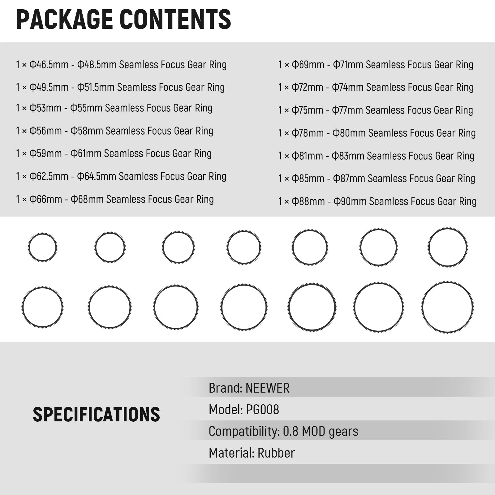 NEEWER PG008 Set di anelli per ingranaggi Follow Focus senza soluzione di continuità da 14 pezzi