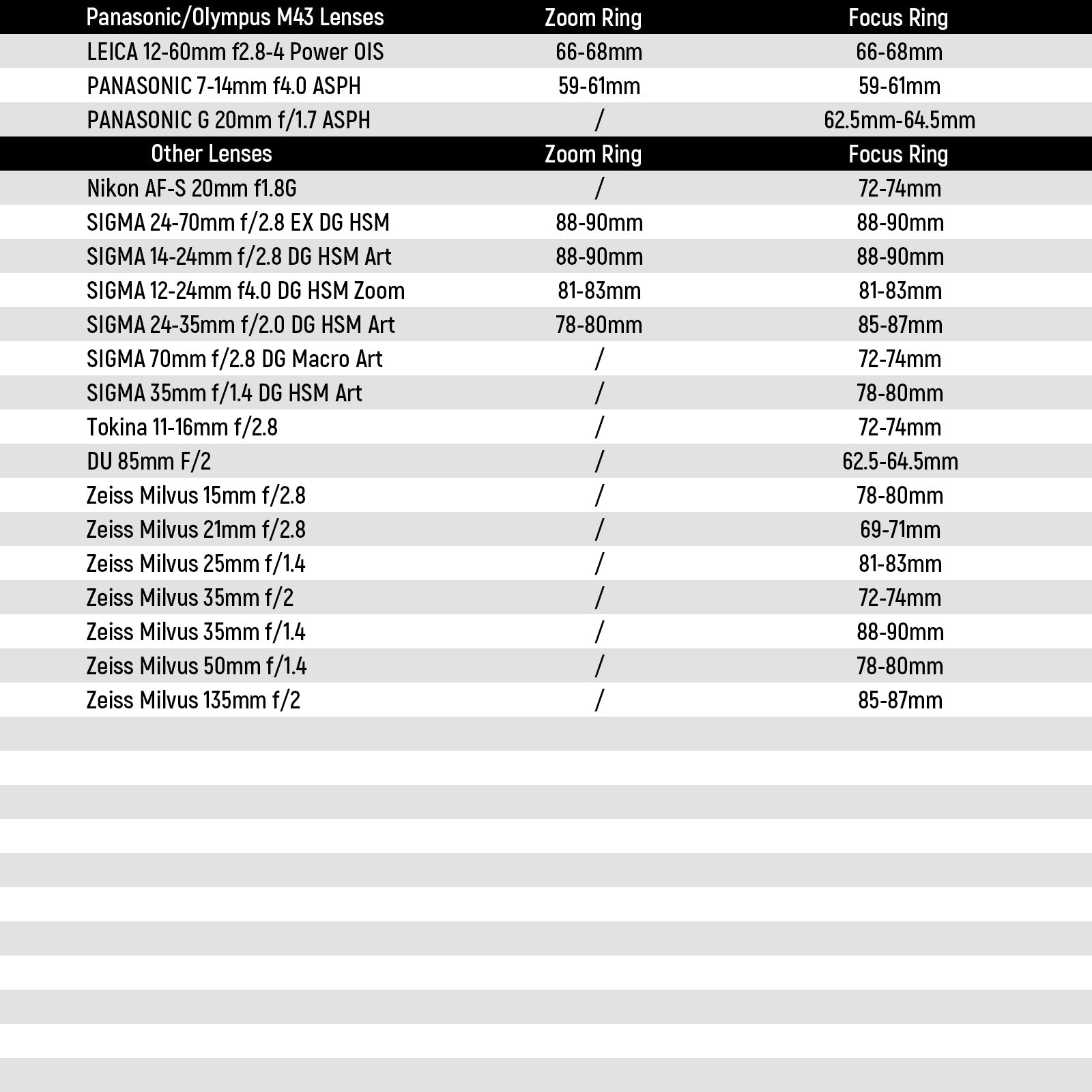- Compatibilità universale : 14 anelli di messa a fuoco si adattano a lenti di vari diametri di lenti della fotocamera: ø46,5-48,5 mm, ø49,5-51,5 mm, ø53-55 mm, ø56-58 mm, ø59-61 mm, ø62,5-64,5 mm, ø66-68 mm, ø69-71 mm, ø72-74 mm, ø75-77 mm, ø78-80 mm, ø81-83 mm, ø85-87 mm, ø88-90 mm