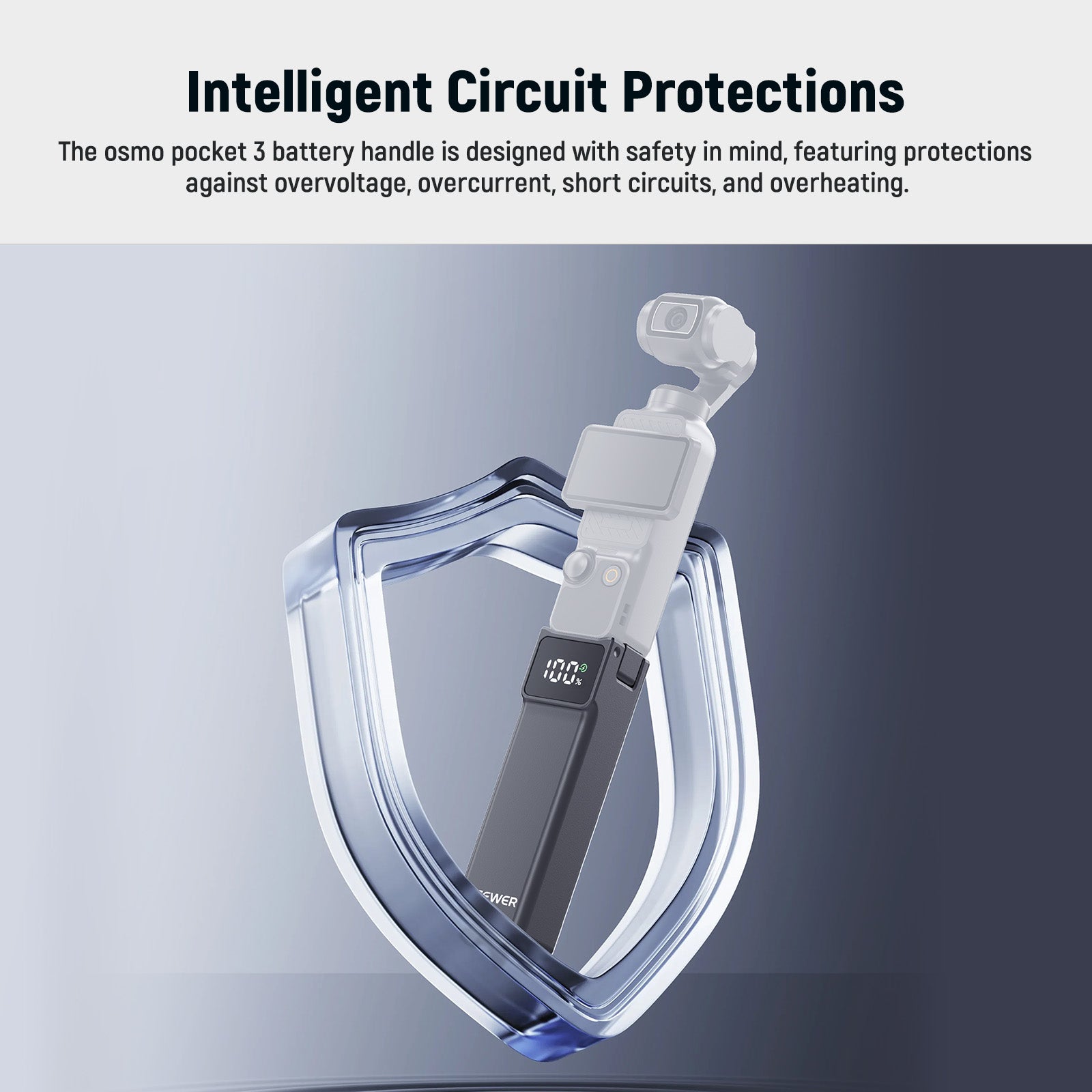 • Intelligent Circuit Protections- The osmo pocket 3 battery handle is designed with safety in mind, featuring protections against overvoltage, overcurrent, short circuits, and overheating. If an issue arises, the handle will automatically shut down after the screen sends an alert, giving you peace of mind while in use