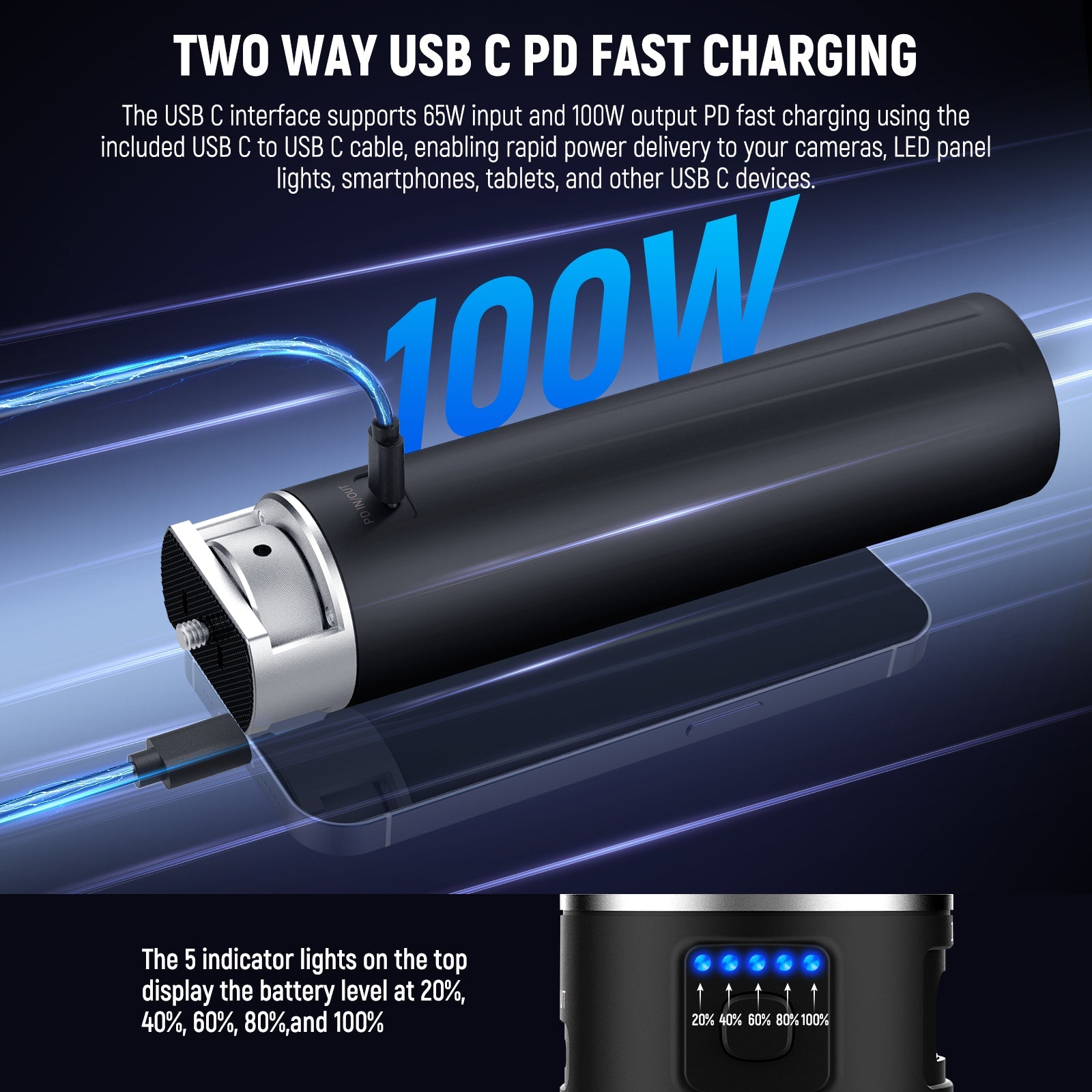 - Ricarica rapida USB C PD bidirezionale : l'interfaccia USB C supporta la ricarica rapida PD da 65 W in ingresso e 100 W in uscita utilizzando il cavo USB C-USB C incluso, consentendo una rapida alimentazione a fotocamere, luci a pannello LED, smartphone, tablet e altri dispositivi USB C. Offre livelli di corrente regolabili per soddisfare le esigenze dei diversi dispositivi e garantire una ricarica ottimale.