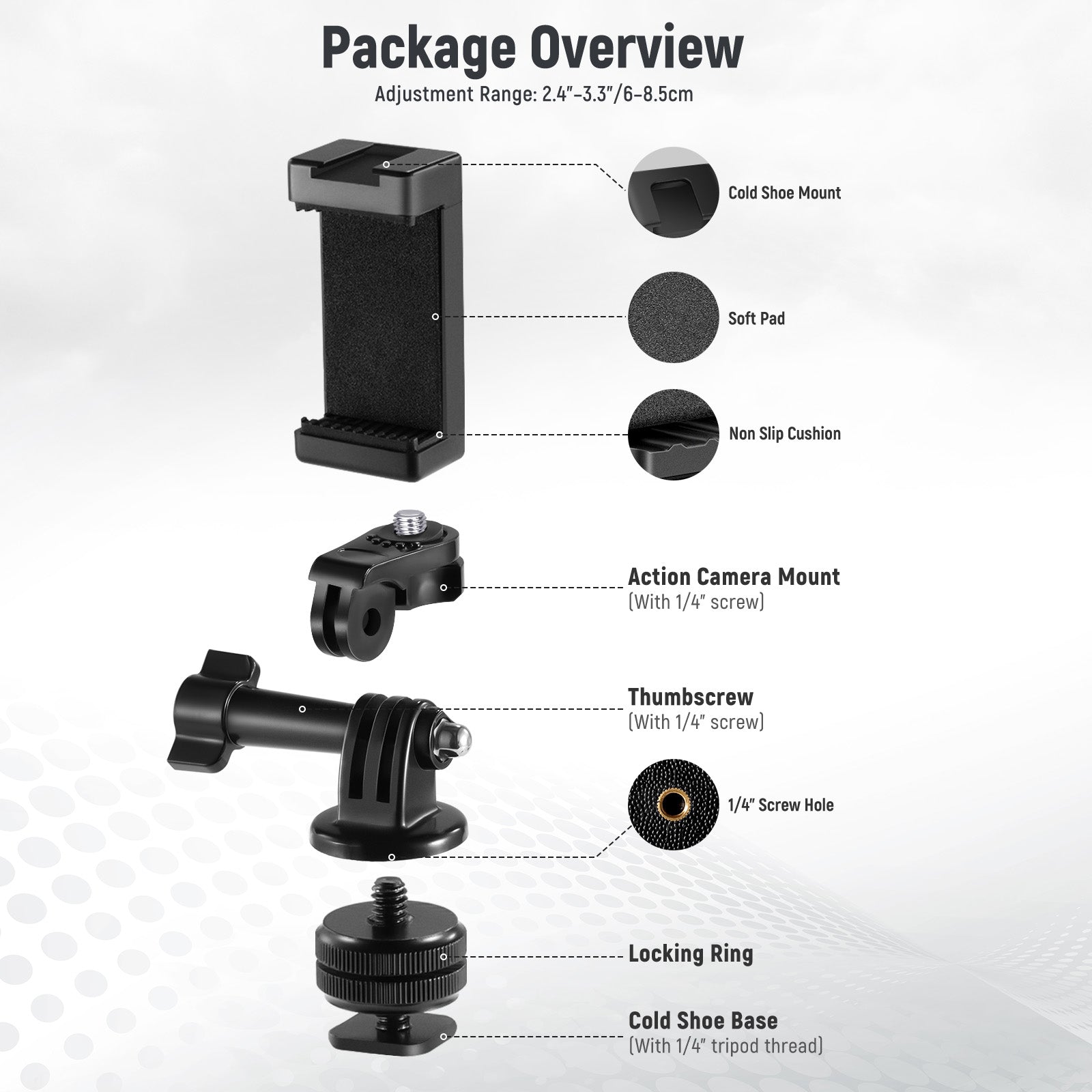 - La confezione contiene: 1 supporto per hot shoe (con filettatura per treppiede da 1/4"), 1 supporto per action camera (con connessione per treppiede da 1/4"), 1 vite a testa zigrinata, 1 adattatore per supporto per action camera (con filettatura per treppiede da 1/4"), 1x Supporto universale per telefono (con attacco per treppiede da 1/4")