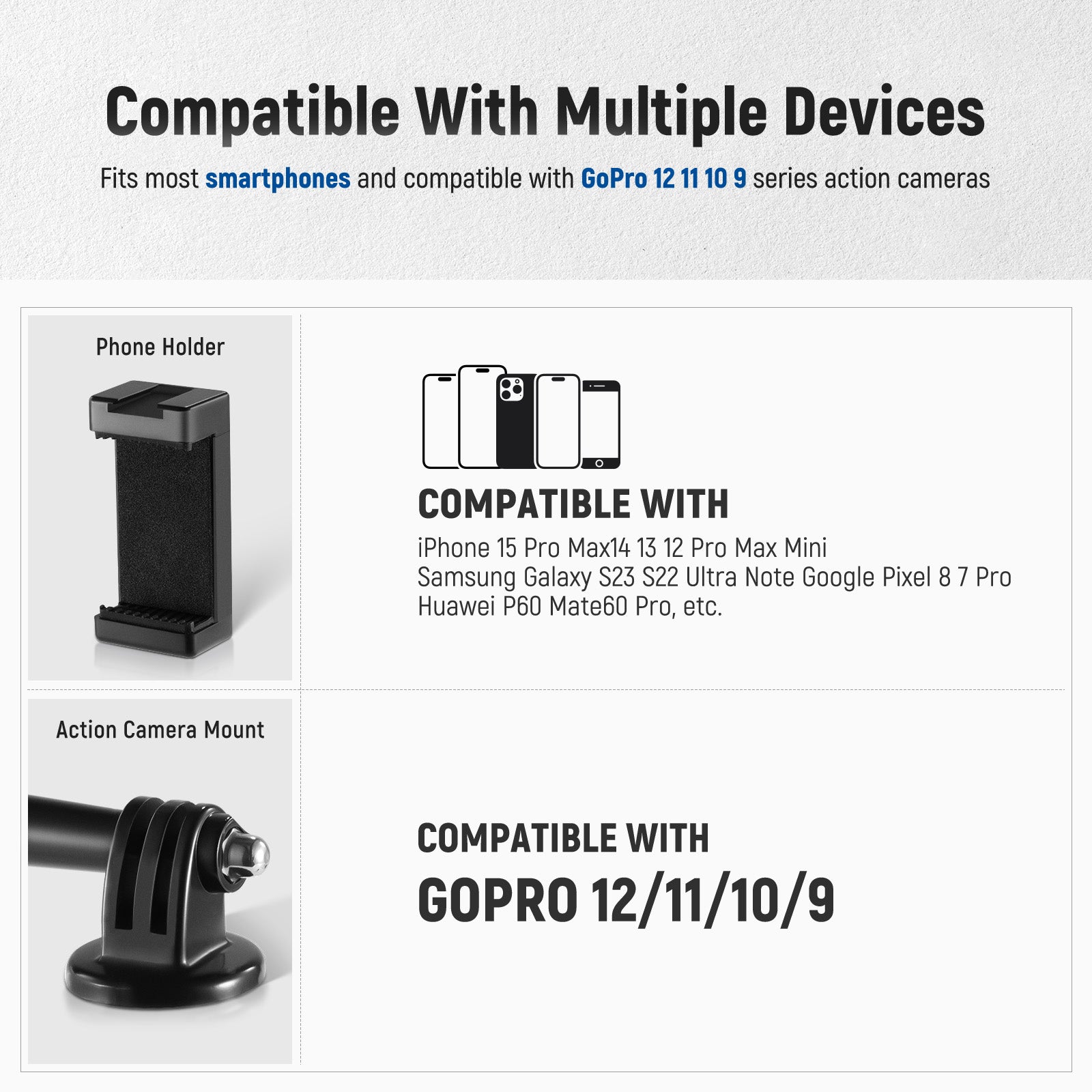 - Compatibile con iPhone 12 11 Pro Max X XR Samsung Huawei GoPro Hero 11 10 9 8 7 6 5 DJI OSMO Action e altri dispositivi con larghezza di 2,4-3,3 pollici (6-8,5 cm)