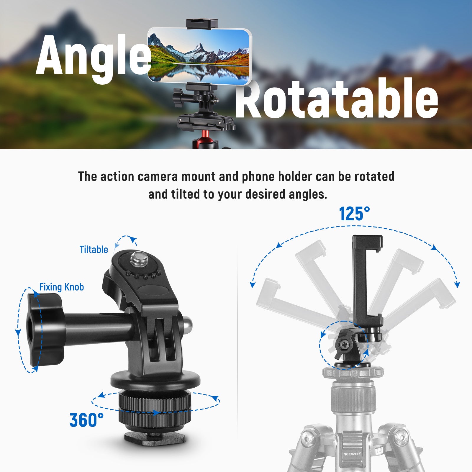 - Il supporto per action cam con filettatura da 1/4" e supporto per telefono può essere installato su un treppiede ed entrambi possono essere ruotati e inclinati agli angoli desiderati.