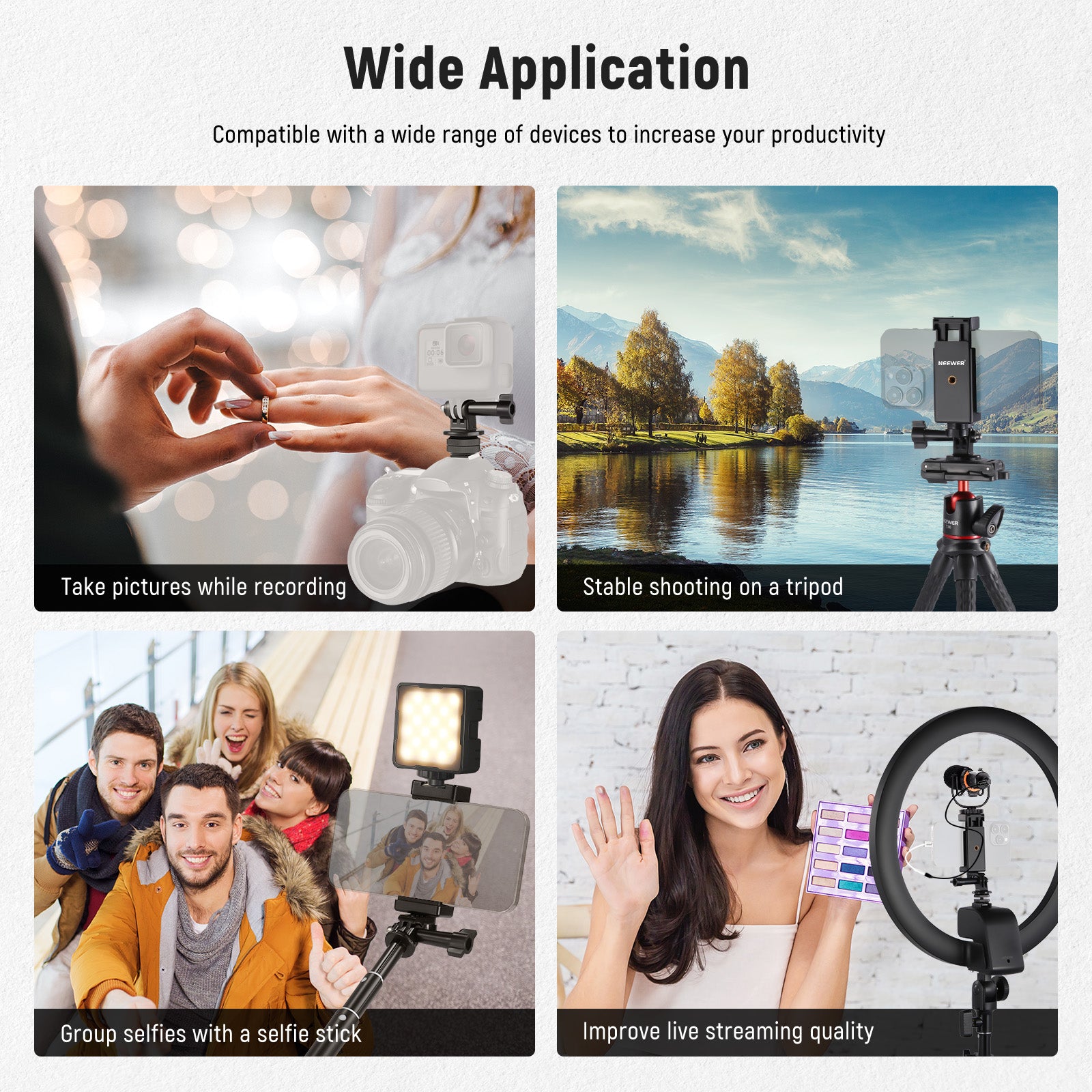 - Il kit include un supporto per hot-shoe, un adattatore per action cam e un supporto universale per telefono, compatibile con le action cam GoPro Hero 11 10 9 o gli smartphone della serie DSLR o anulare