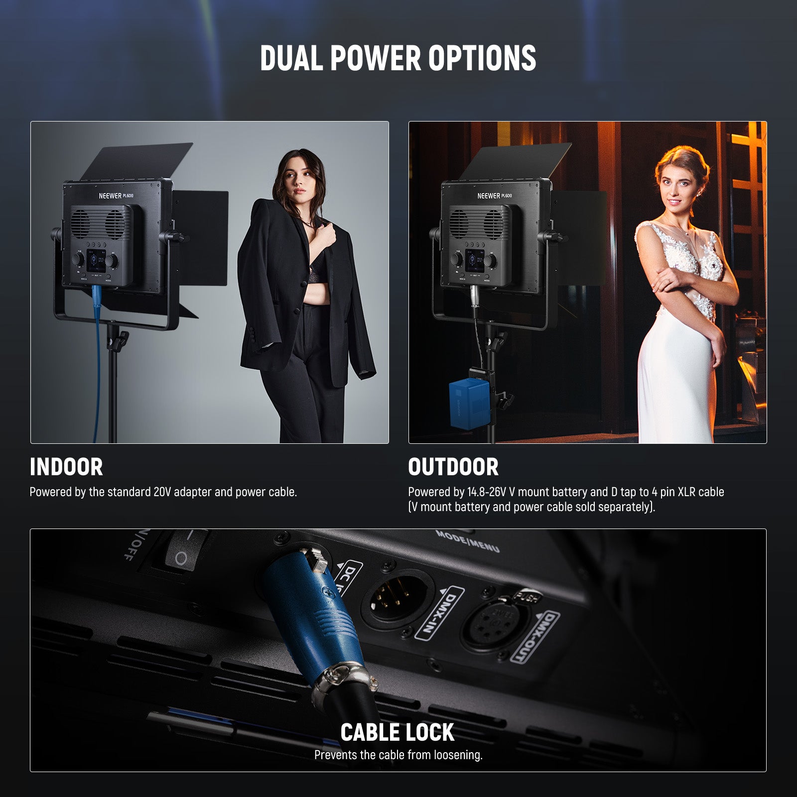- Doppia alimentazione per illuminazione interna ed esterna : questa attrezzatura video con pannello portatile funziona tramite corrente alternata con l'adattatore da 20 V e il cavo di alimentazione CA inclusi. Oppure, quando non sono disponibili prese a muro, puoi alimentarla utilizzando una batteria con attacco V (14,8-26 V) e un cavo D tap a 4 pin XLR (batteria e cavo D tap venduti separatamente), assicurando riprese e riprese video all'aperto prolungate. La porta CC con un design di bloccaggio impedisce la disconnessione accidentale dell'alimentazione durante l'uso