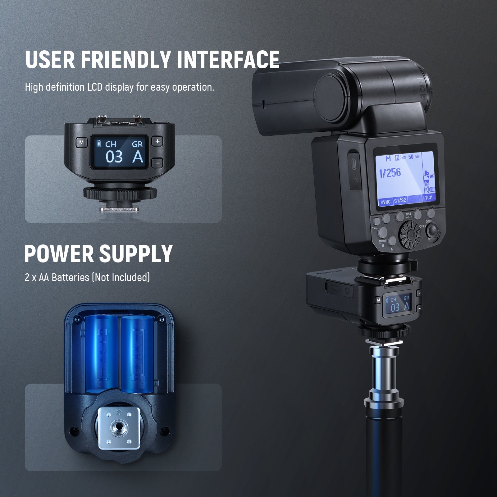 - Controllo raggruppato wireless 2.4G - La connessione stabile a 2,4 GHz consente l'attivazione flash a lungo raggio di 5 gruppi (A, B, C, D, E), 32 canali e 99 ID (01-99) entro 328 piedi/100 m. Supporta la sincronizzazione flash raggruppata per un controllo dell'illuminazione più versatile