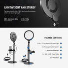 - Illuminazione e altezza regolabili : premere il pulsante modalità per alternare la temperatura colore da 3000 K, 3500 K, 4400 K, 5600 K a 6500 K. Regolare e controllare l'intensità della luce circolare dal 10% al 100%. Fornisce luce principale o di riempimento per fotografia, videografia e servizi fotografici. Impostare l'altezza desiderata tramite l'asta centrale telescopica, mentre la base in metallo la mantiene stabile senza occupare troppo spazio, ideale per estetisti, truccatori, streamer di social media o creatori di contenuti.