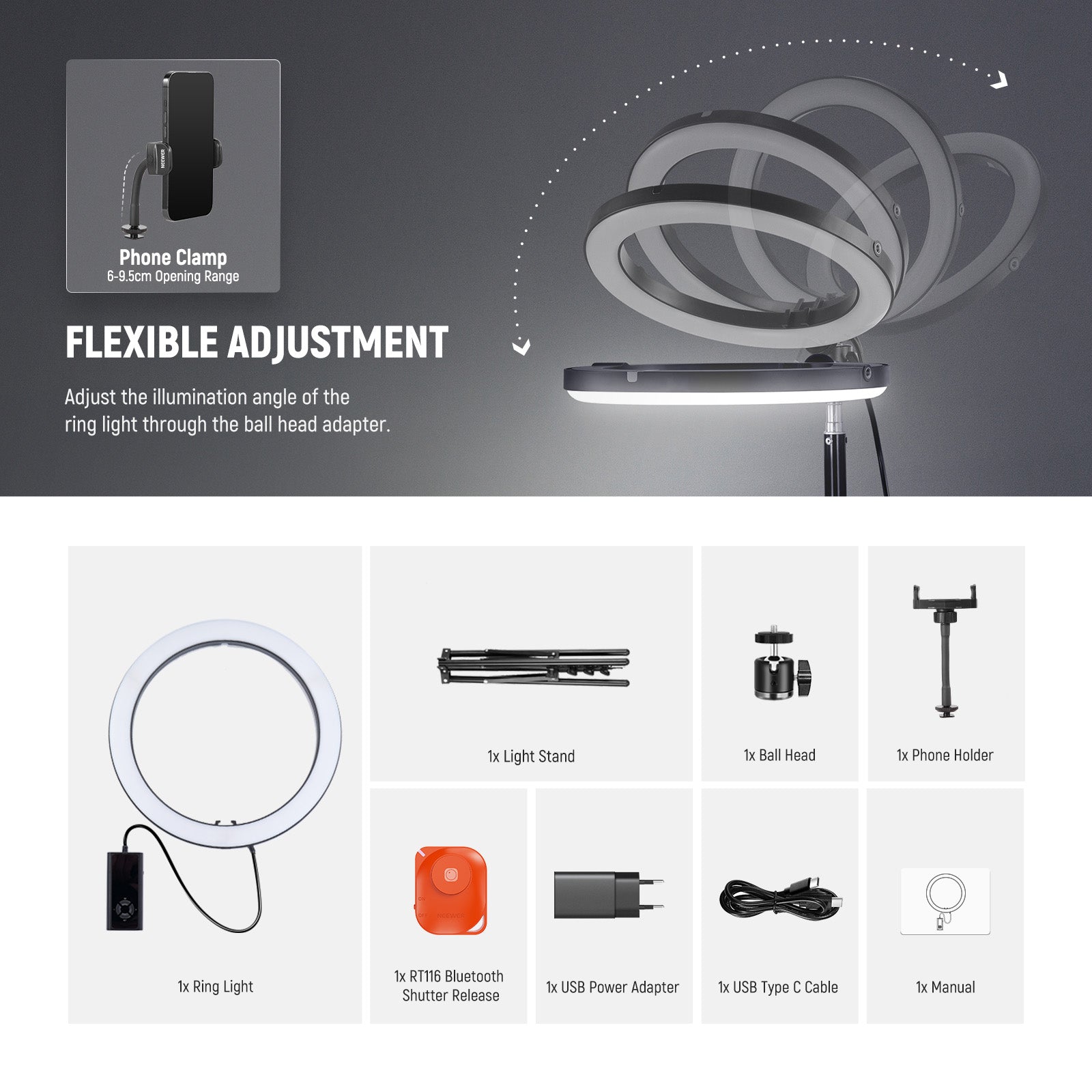 - USB Type C PD Input & Shutter Release- Efficiently powered using the included USB C PD charger and USB C cable, the big RGB circle ring light operates stably to ensure uninterrupted shooting sessions. An RT116 Bluetooth shutter release is contained for convenient remote control, allowing you to film, take photos or start/stop video recording from a distance, ideal standing lighting gear for selfies, group shots, or long exposure photography and videography